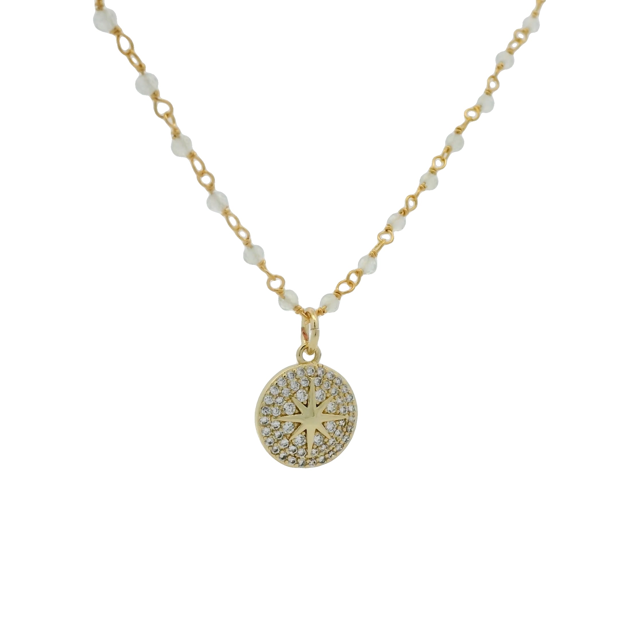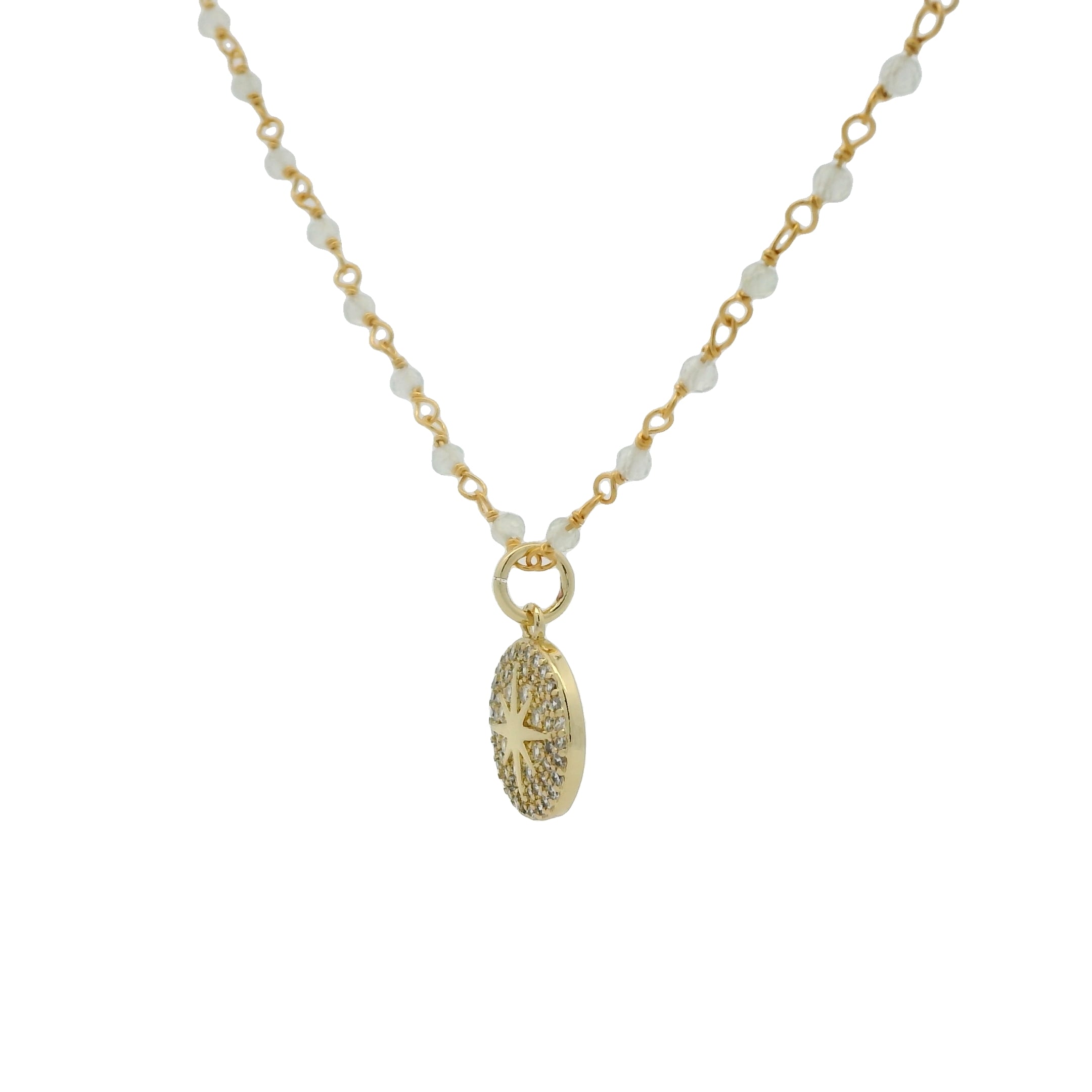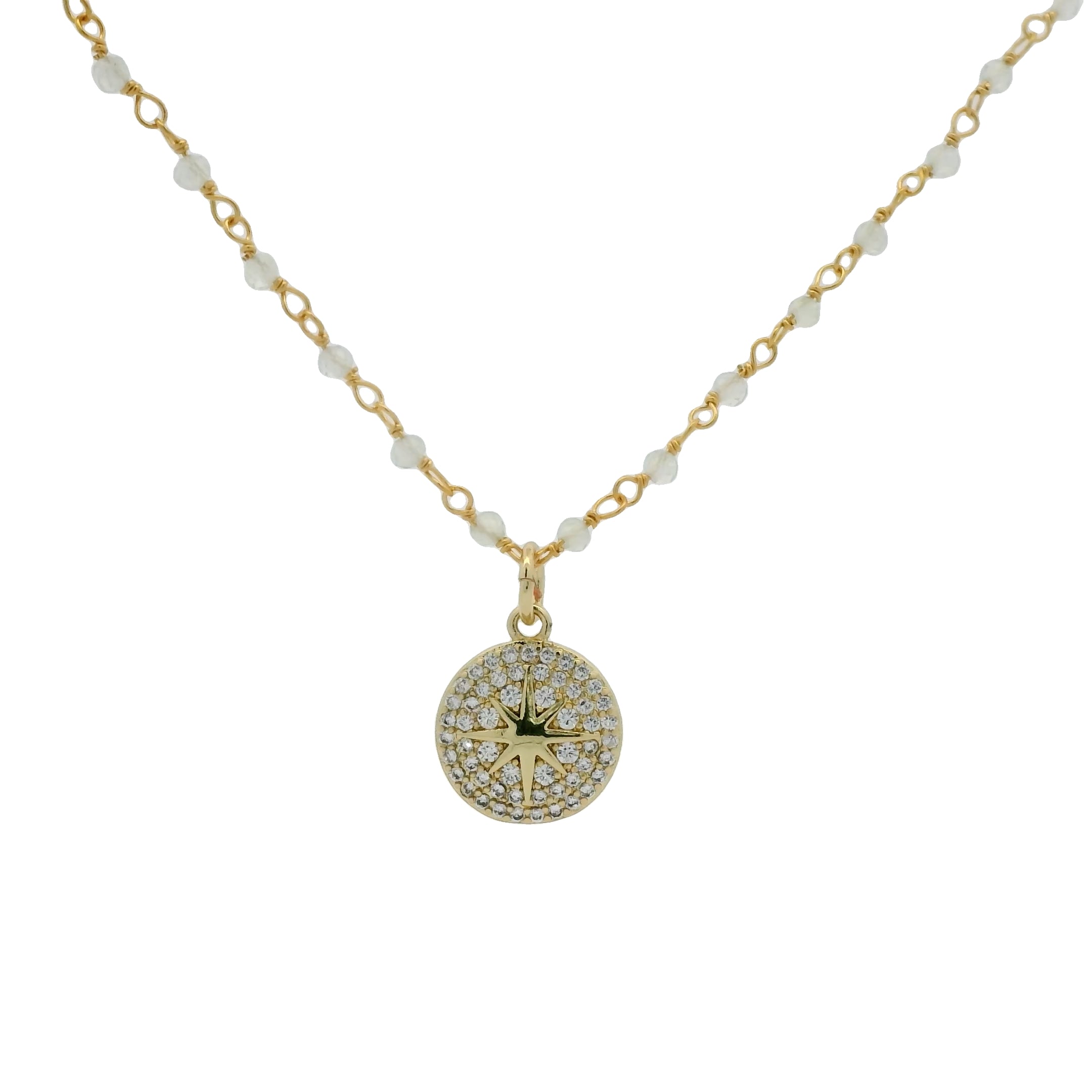 Collier doré rosary pierre de lune et médaille rose des vents 50 cm