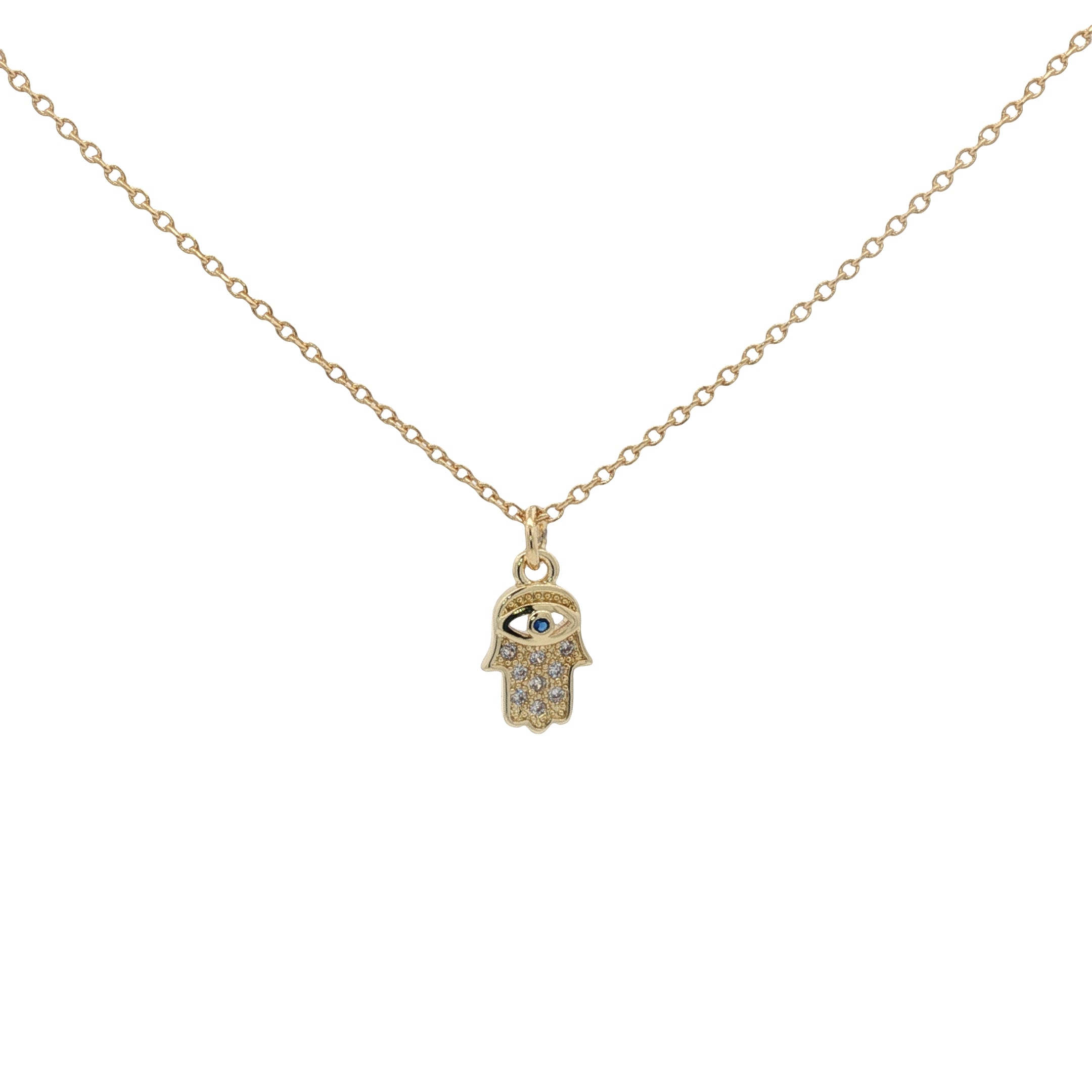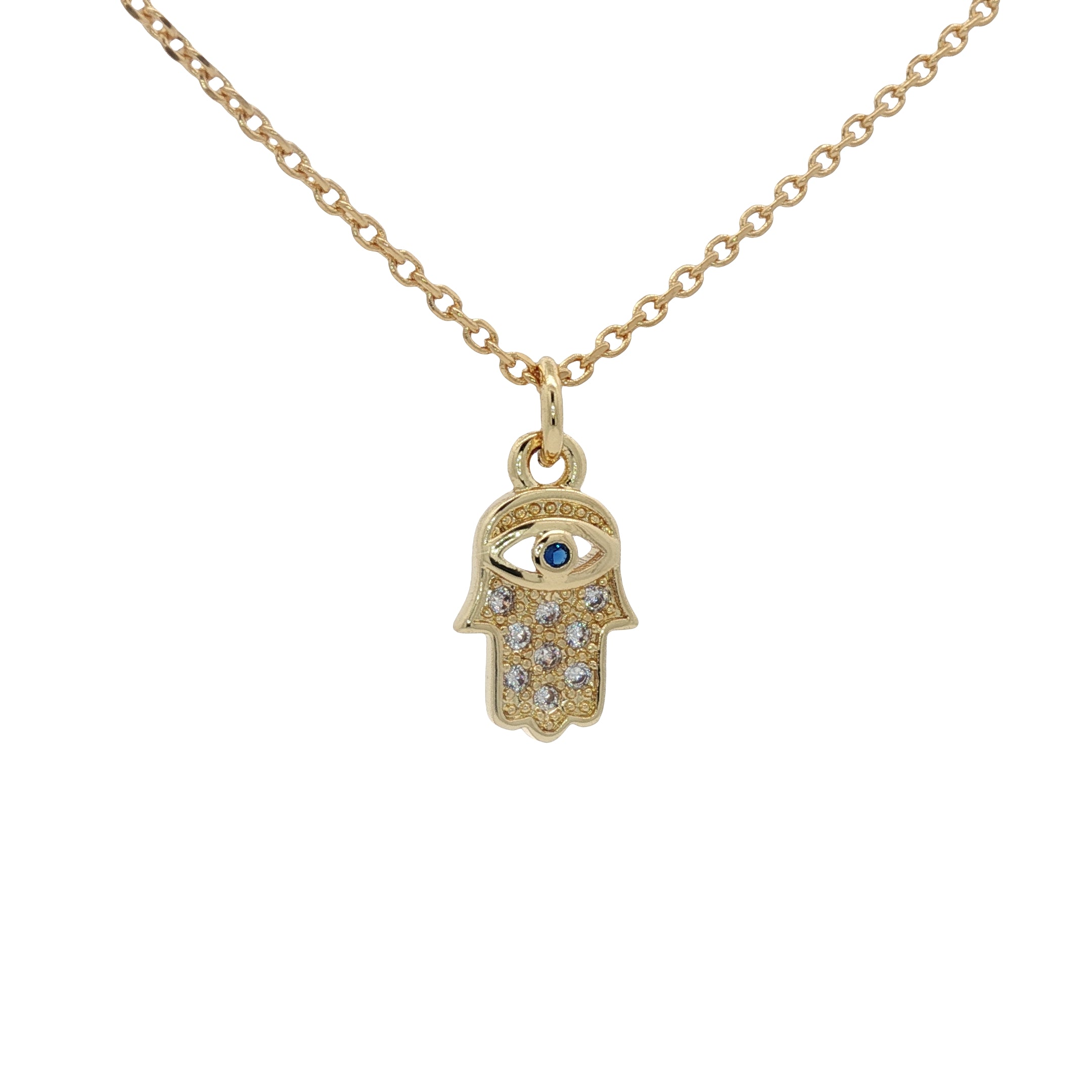 Collier doré main de Fatma avec oeil et zircons 42 cm