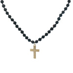 Collier croix dorée zircons perles en bois marron 90 cm