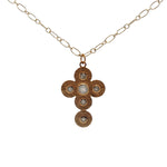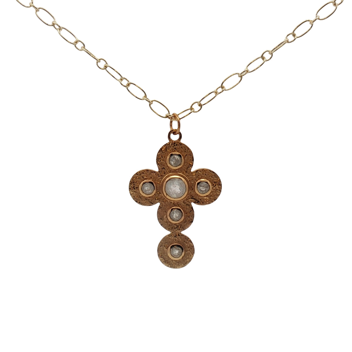 Collier doré croix martelée angles arrondis avec pierre de lune 75 cm