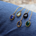 Necklace in brass gilded with 18k fine gold and pendant in faceted natural stone trapped in its wire weave.