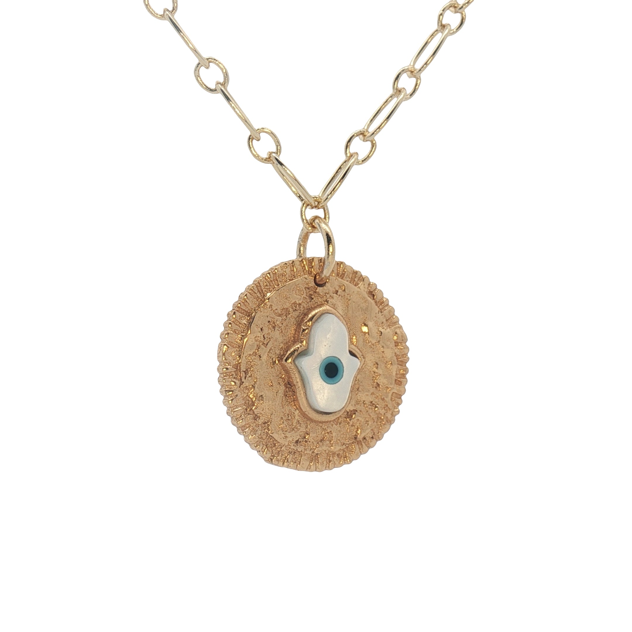 Collier doré medaille main de Fatma nacre avec oeil 42 cm