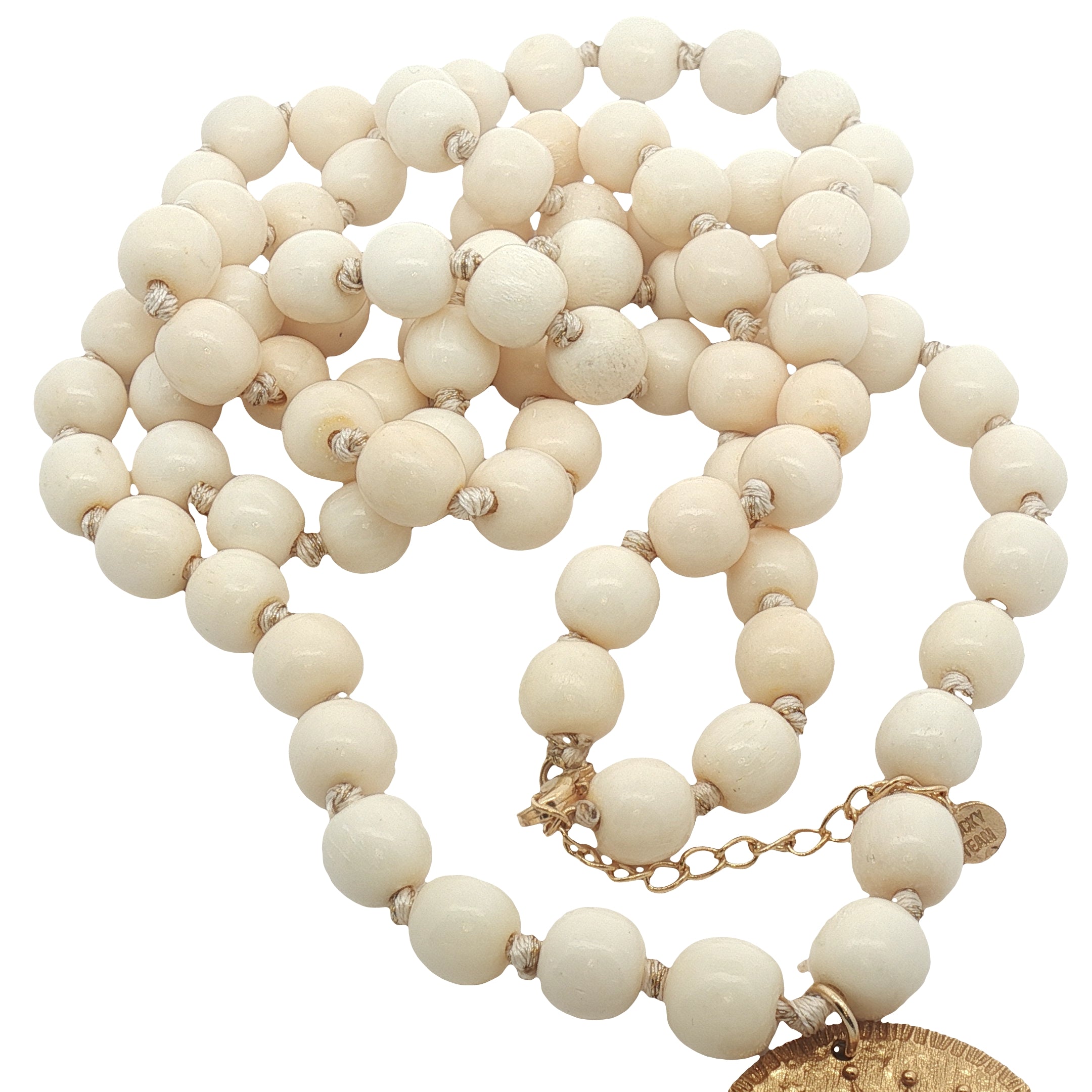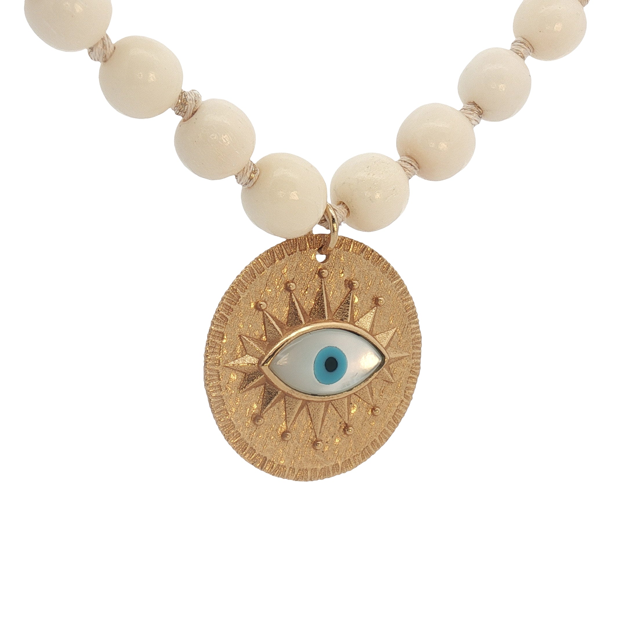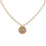 Collier doré médaillon avec oeil en nacre perles en os 90 cm