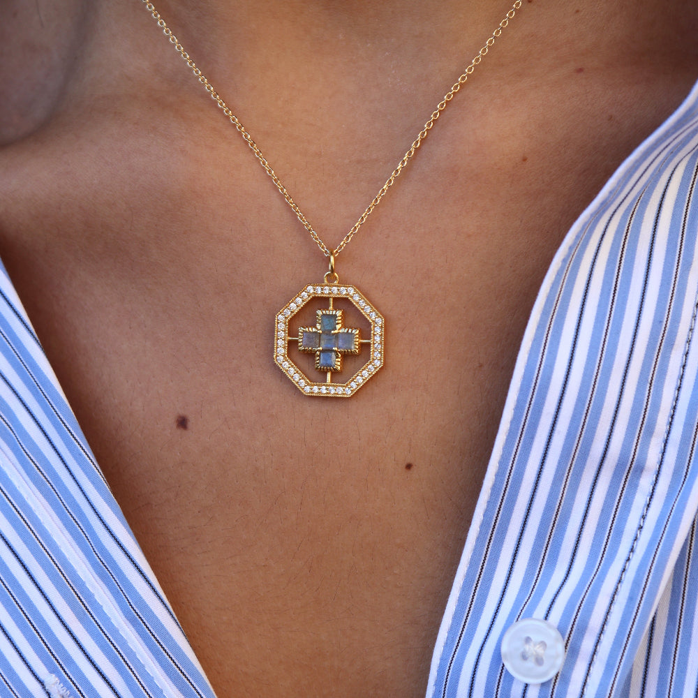 Necklace in brass gilded with 18k fine gold and octagonal pendant inlaid with a square cross in natural stones.