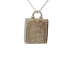 925 silver necklace and hand-stamped matte pendant. Floral motifs adorn the box.