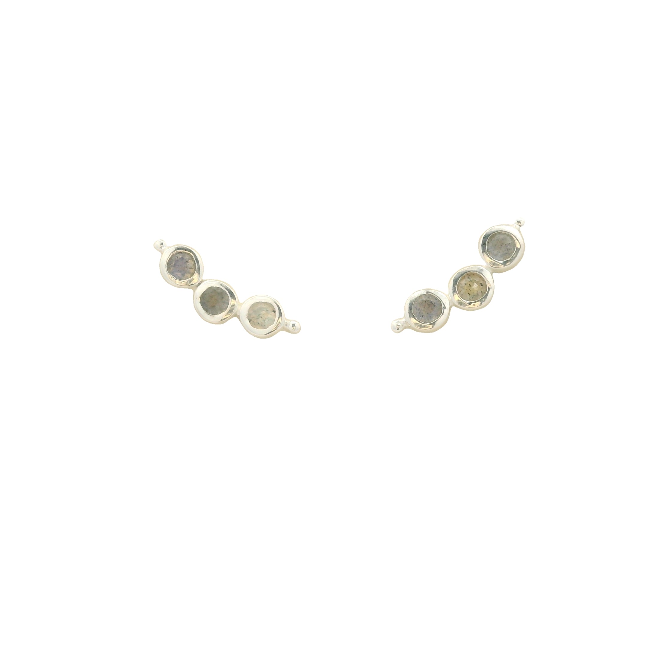 925 silver stud earrings decorated with labradorite. Like small ear cuffs, the earrings, worked in a rounded shape, fit the shape of the ear.