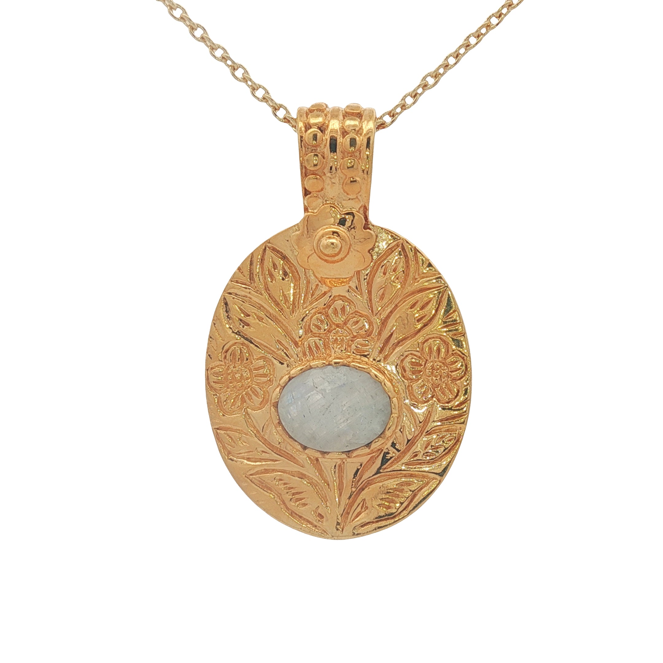 Gold necklace with engraved flower and stone pendant