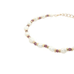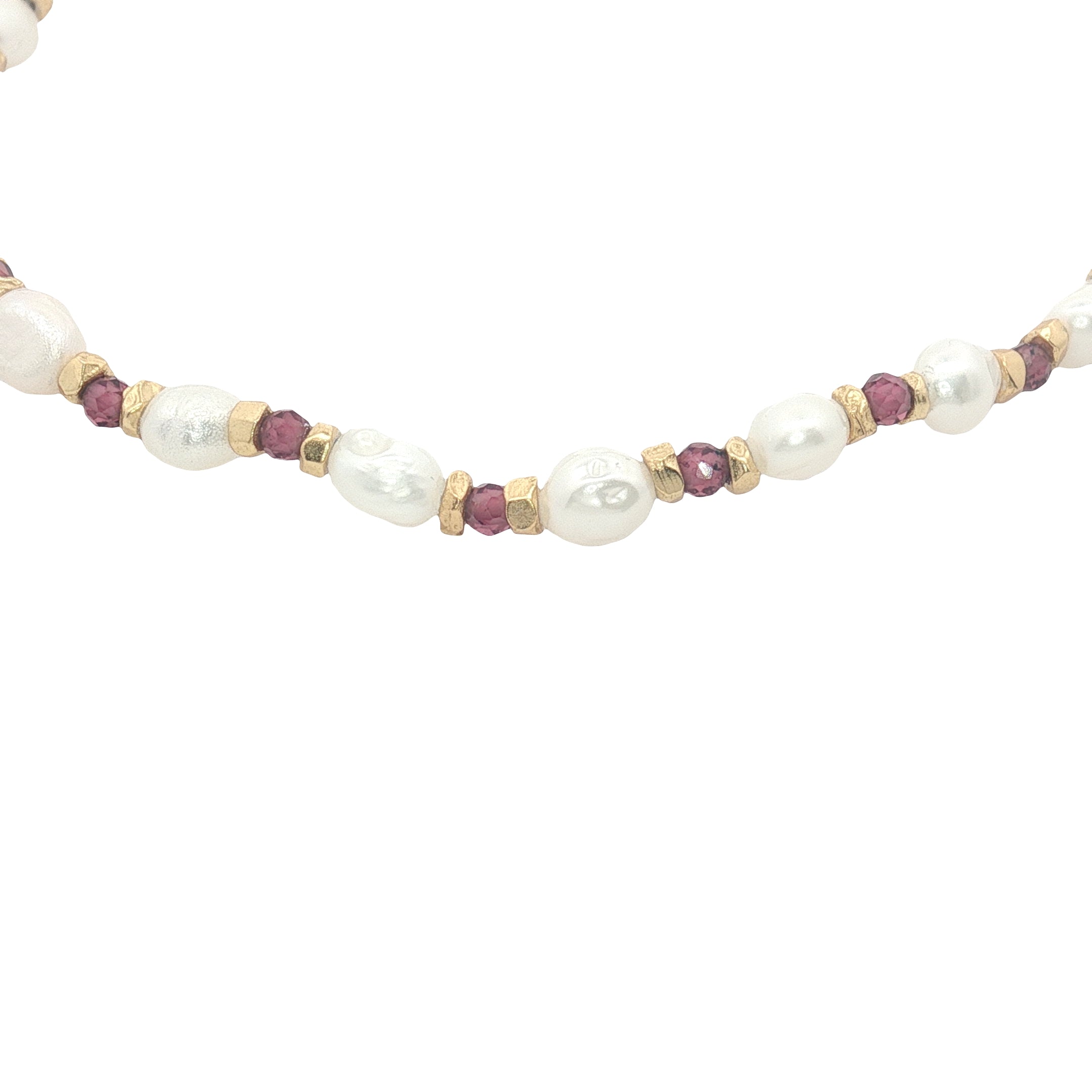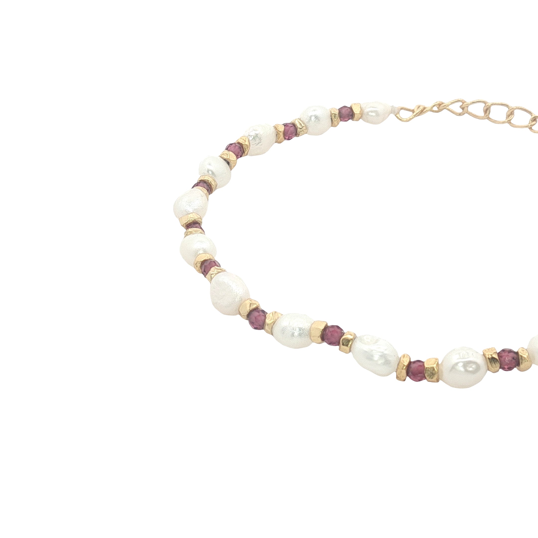 Bracelet avec alternance de perles de culture irrégulières, perles dorées et grenat