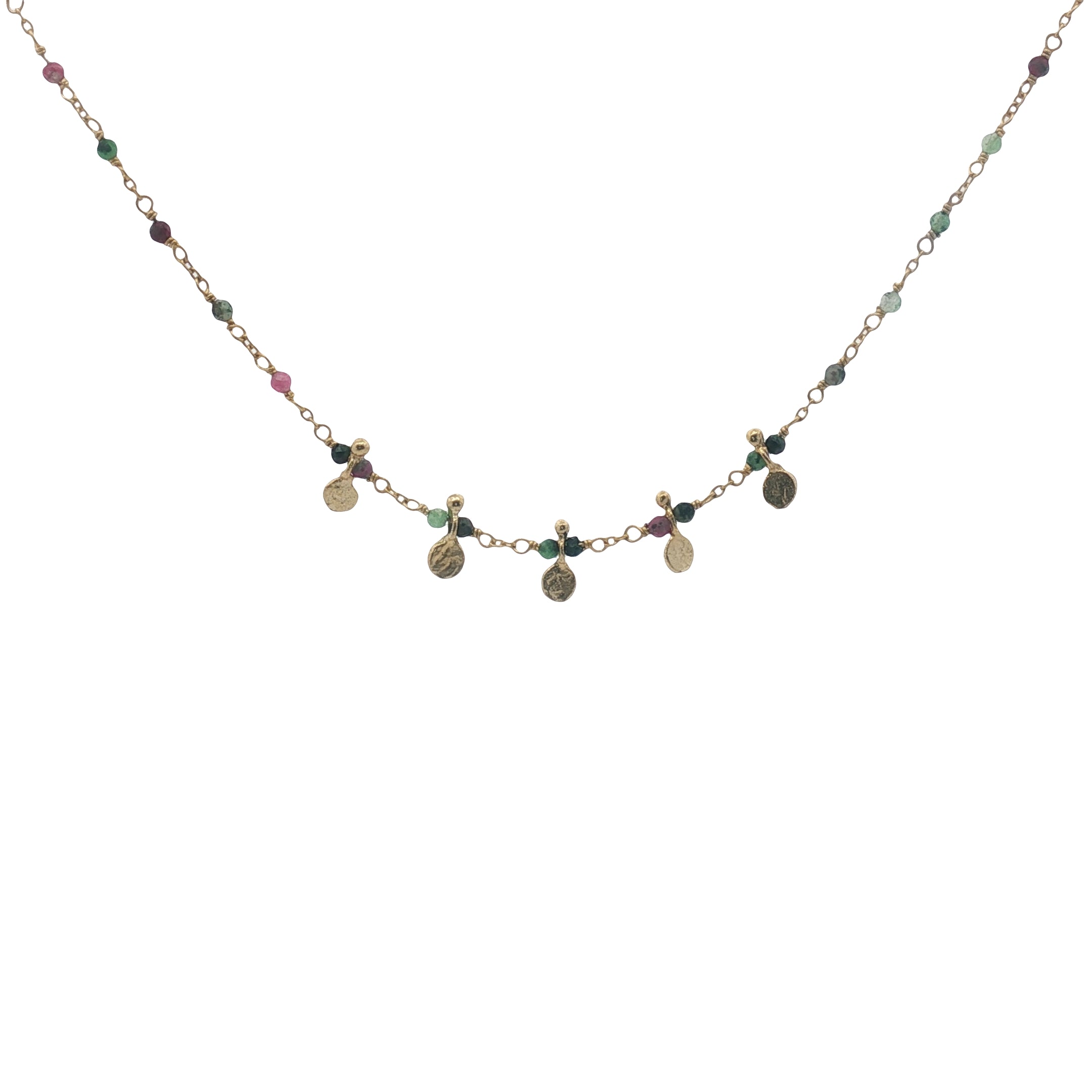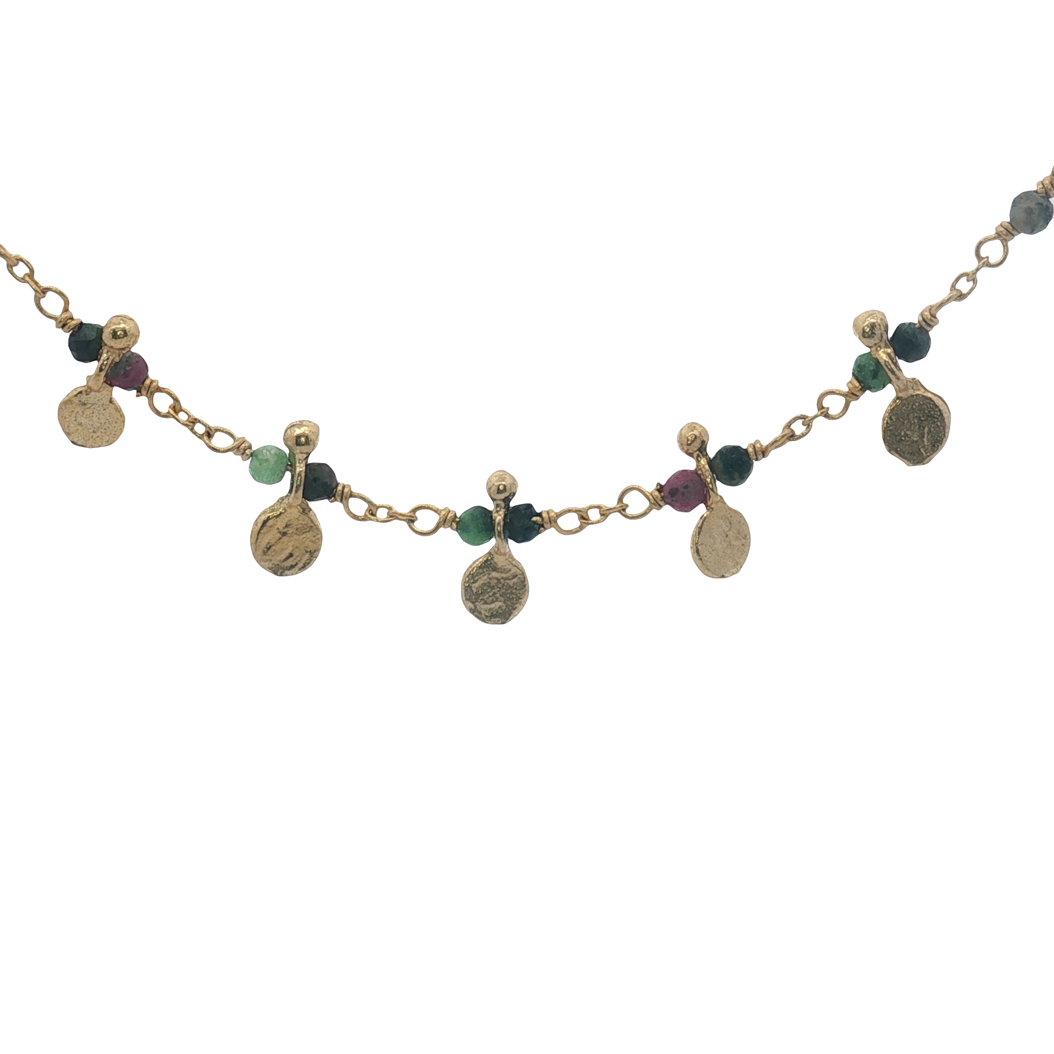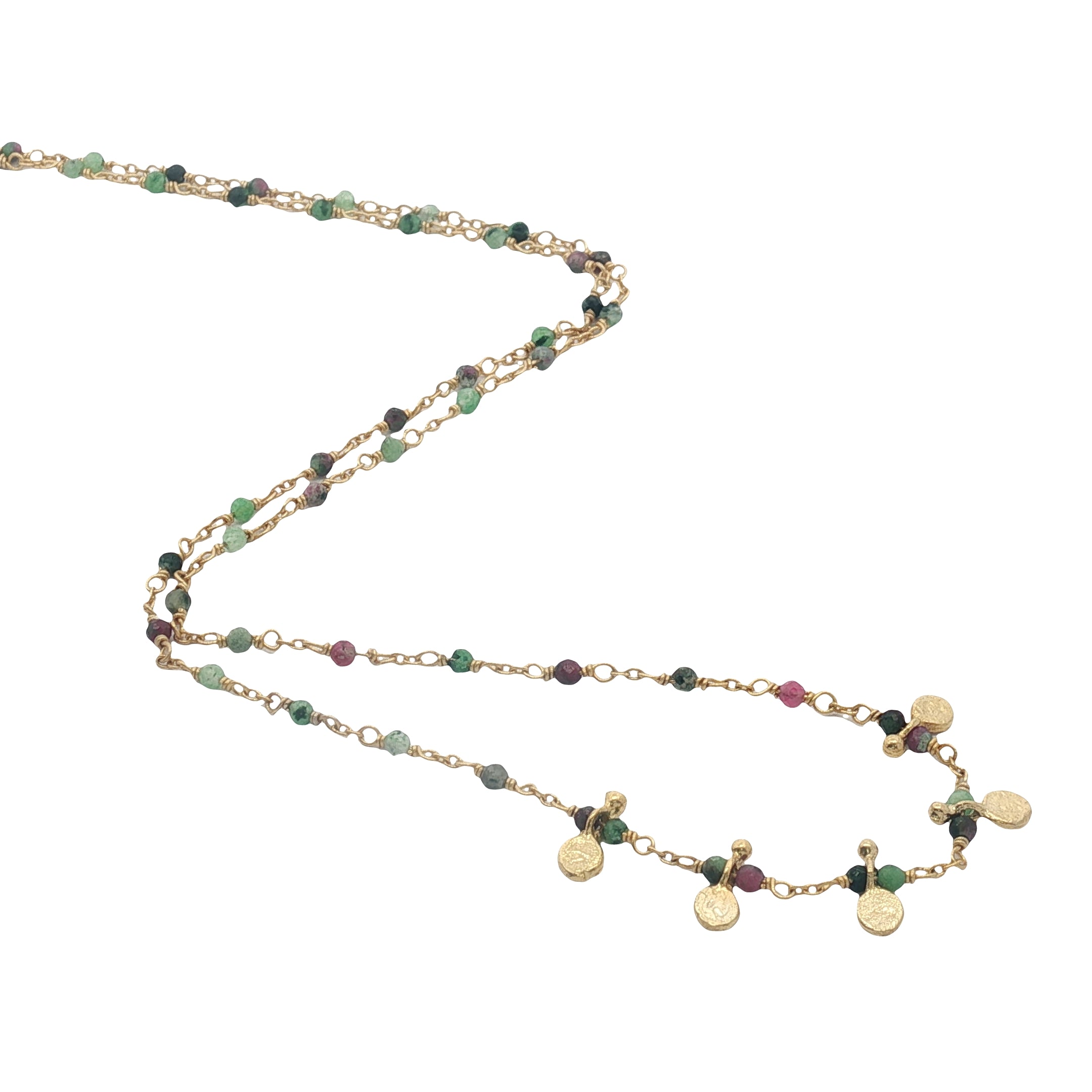 Collier doré chaine rosary rubis zoisite 5 pampilles dorées 50 cm