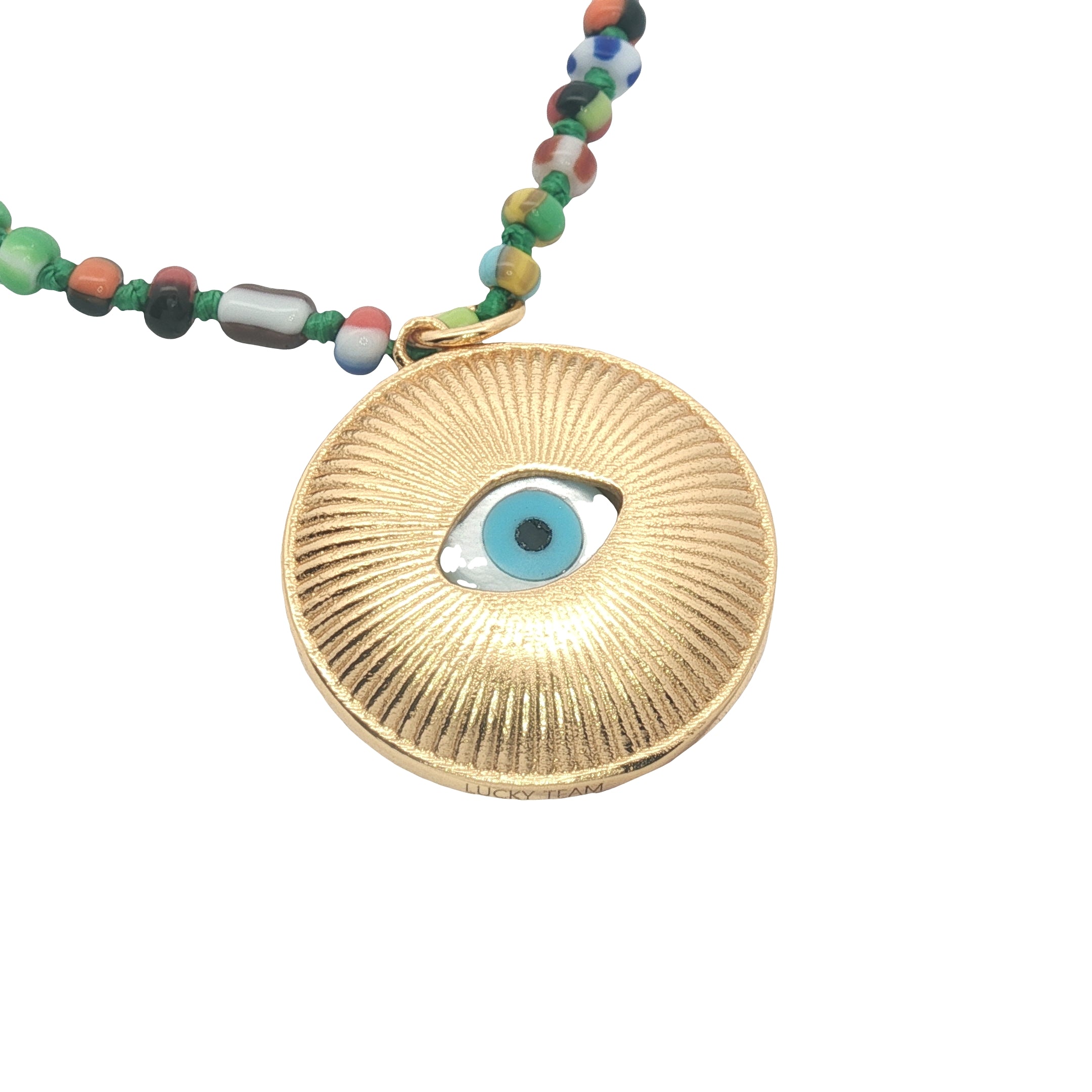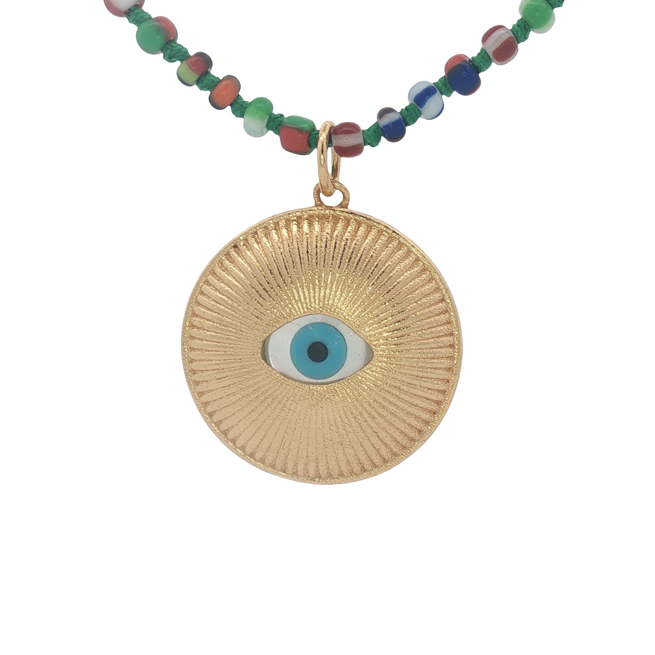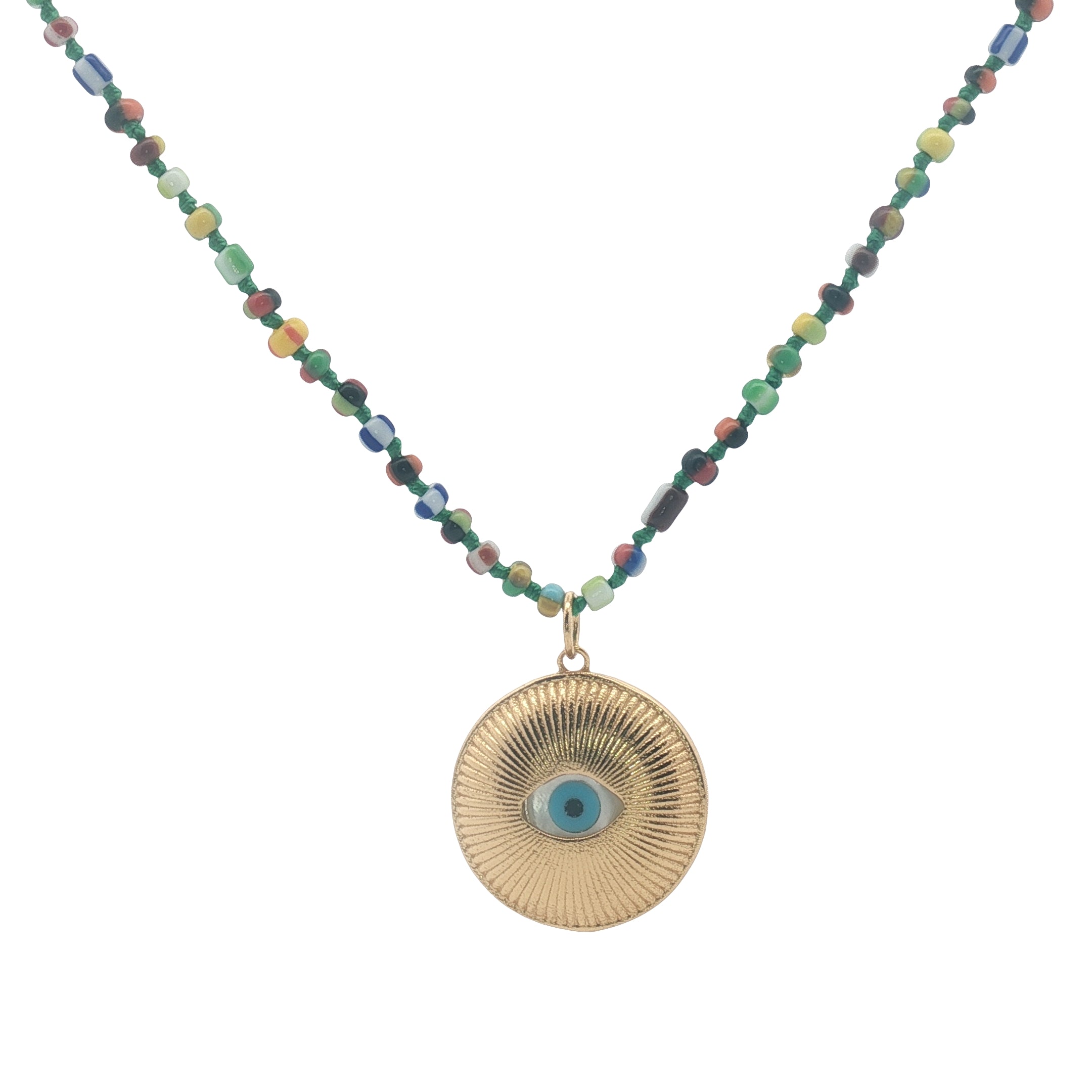 Collier doré médaille oeil en nacre perles multicolores 50 cm