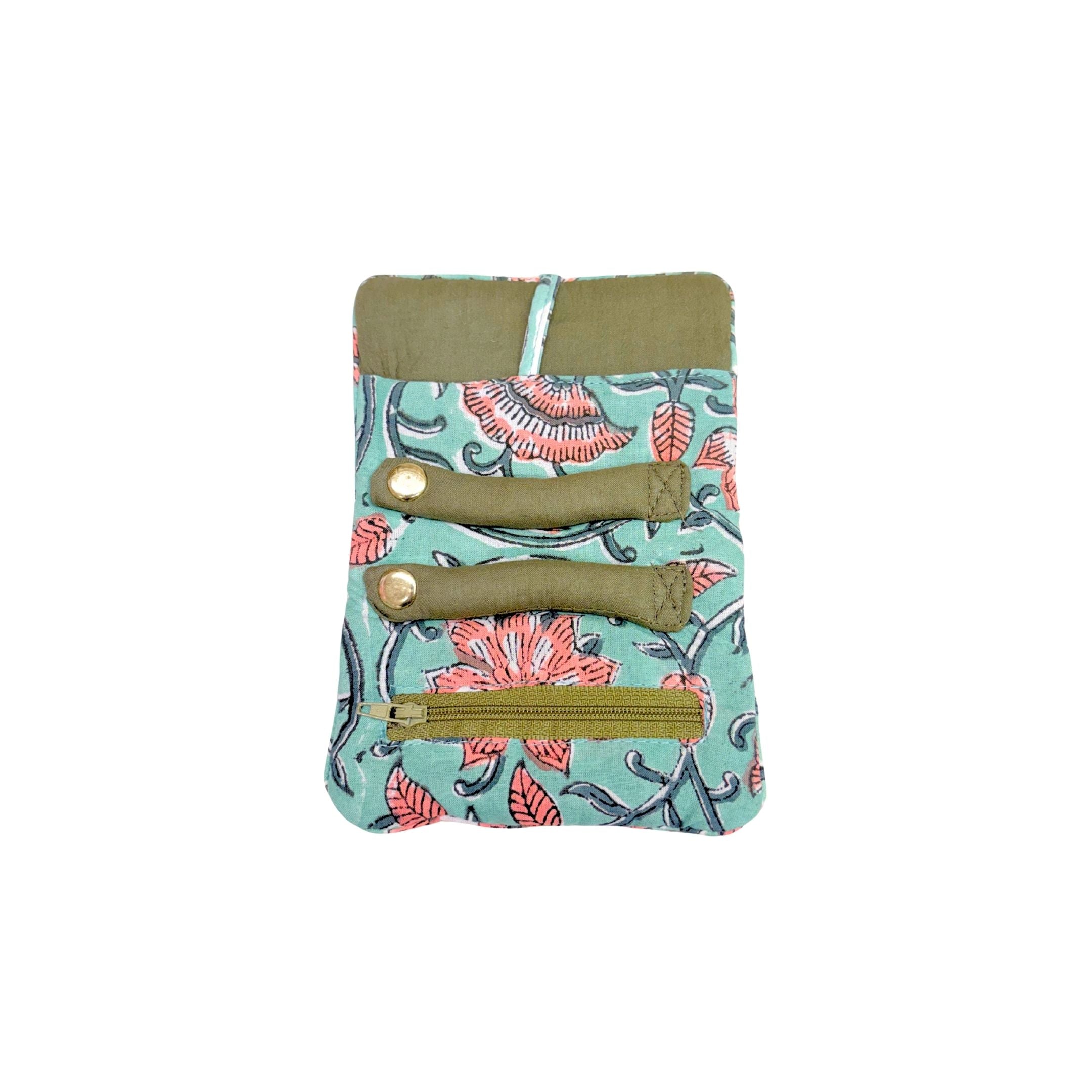Pochette à bijoux bleu marine à fleurs blanches et oranges