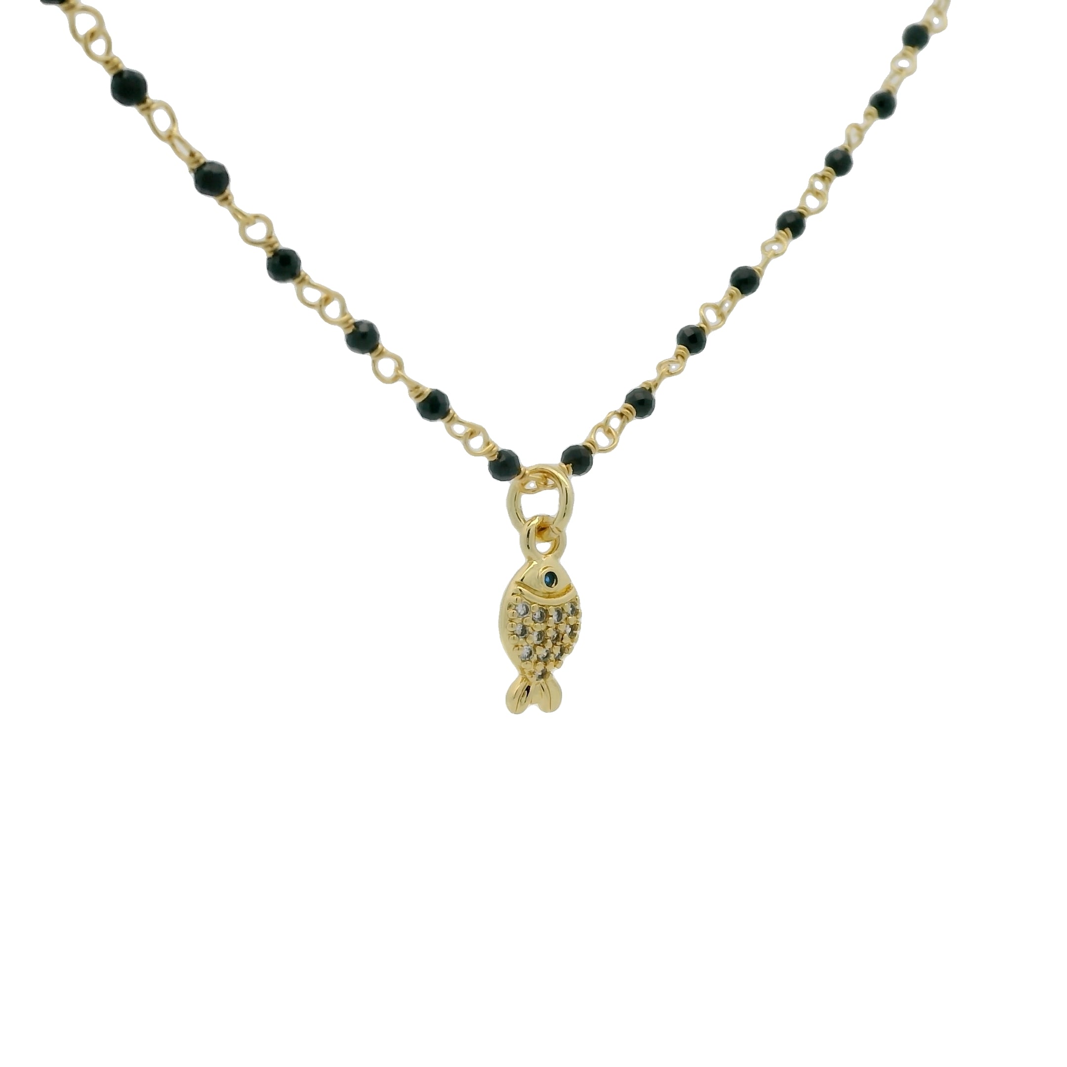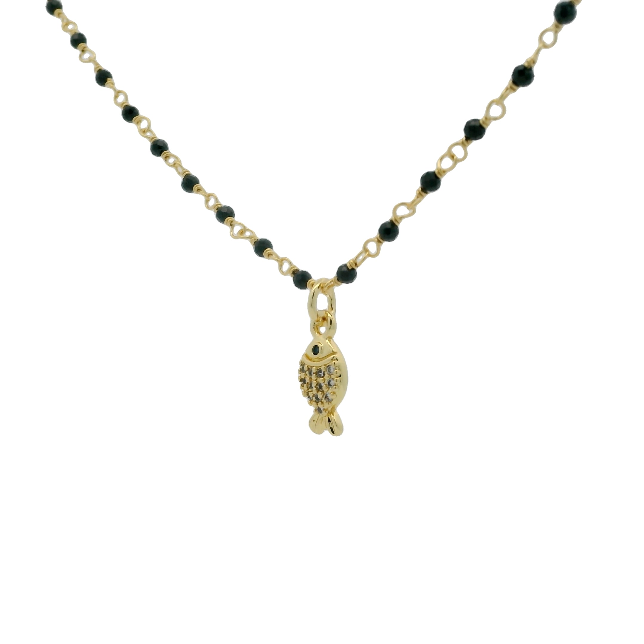 Collier doré rosary onyx noire et poisson zircons blancs 38 cm