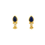 Earrings in brass gilded with 18k fine gold with a drop-cut stone. A white zircon adorns the underside of the stone and is finished with a tassel of 3 golden balls.