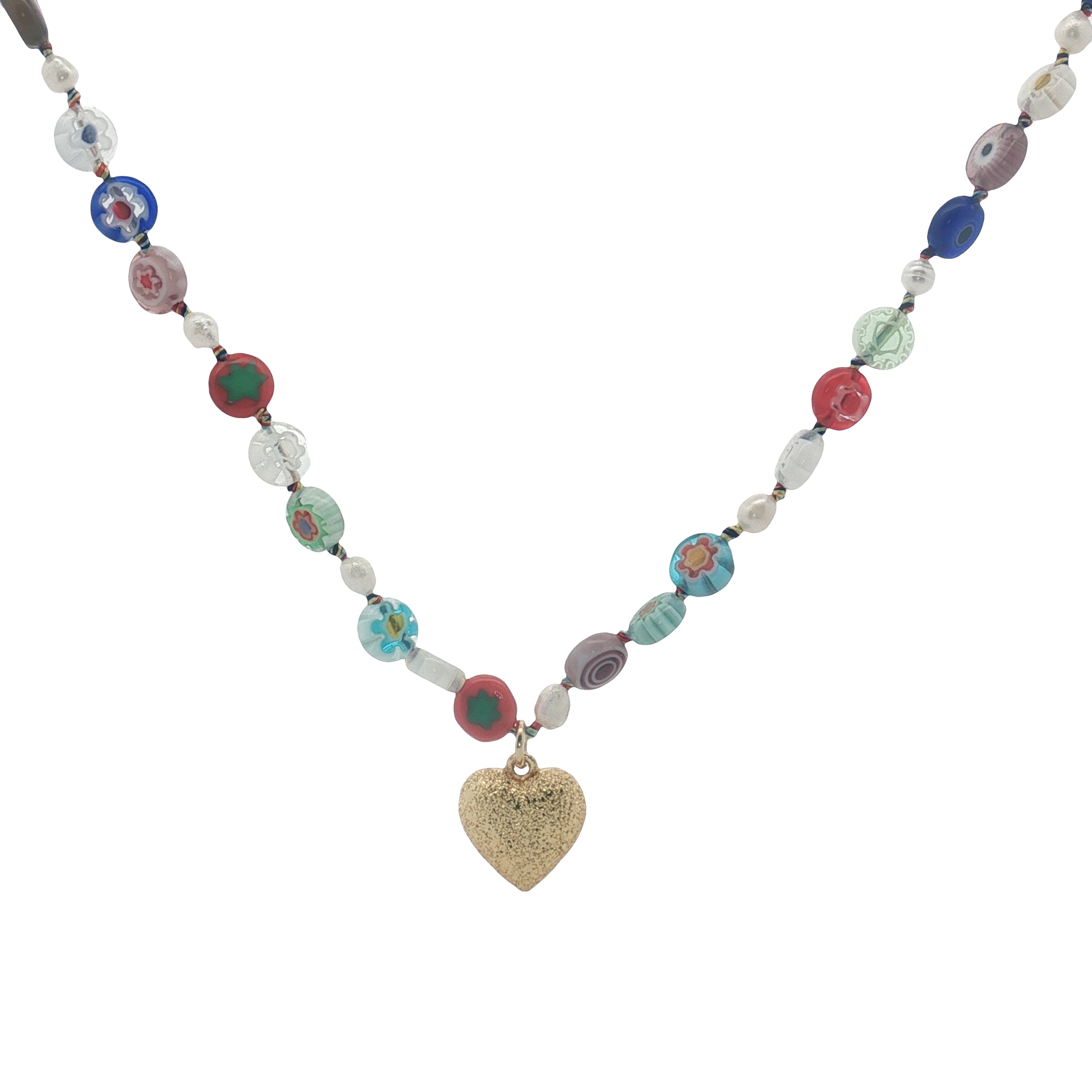 Collier doré coeur perles colorées avec fleurs et perles de culture 75 cm