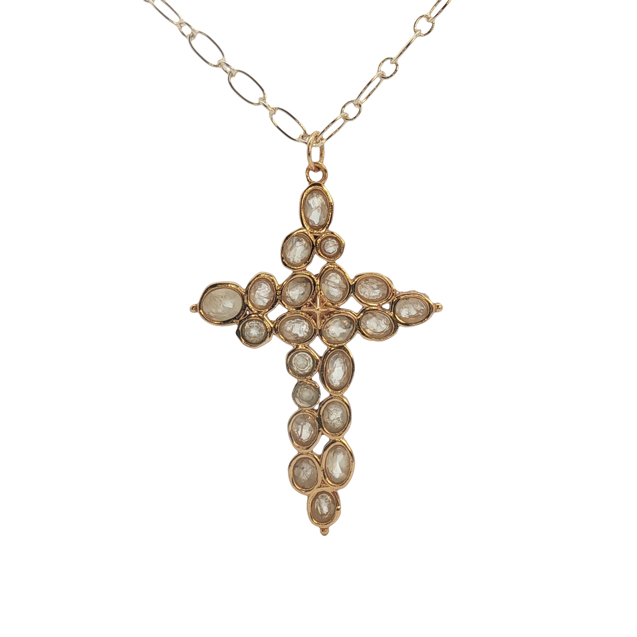 Collier doré croix martelée angles arrondis avec pierre de lune 75 cm
