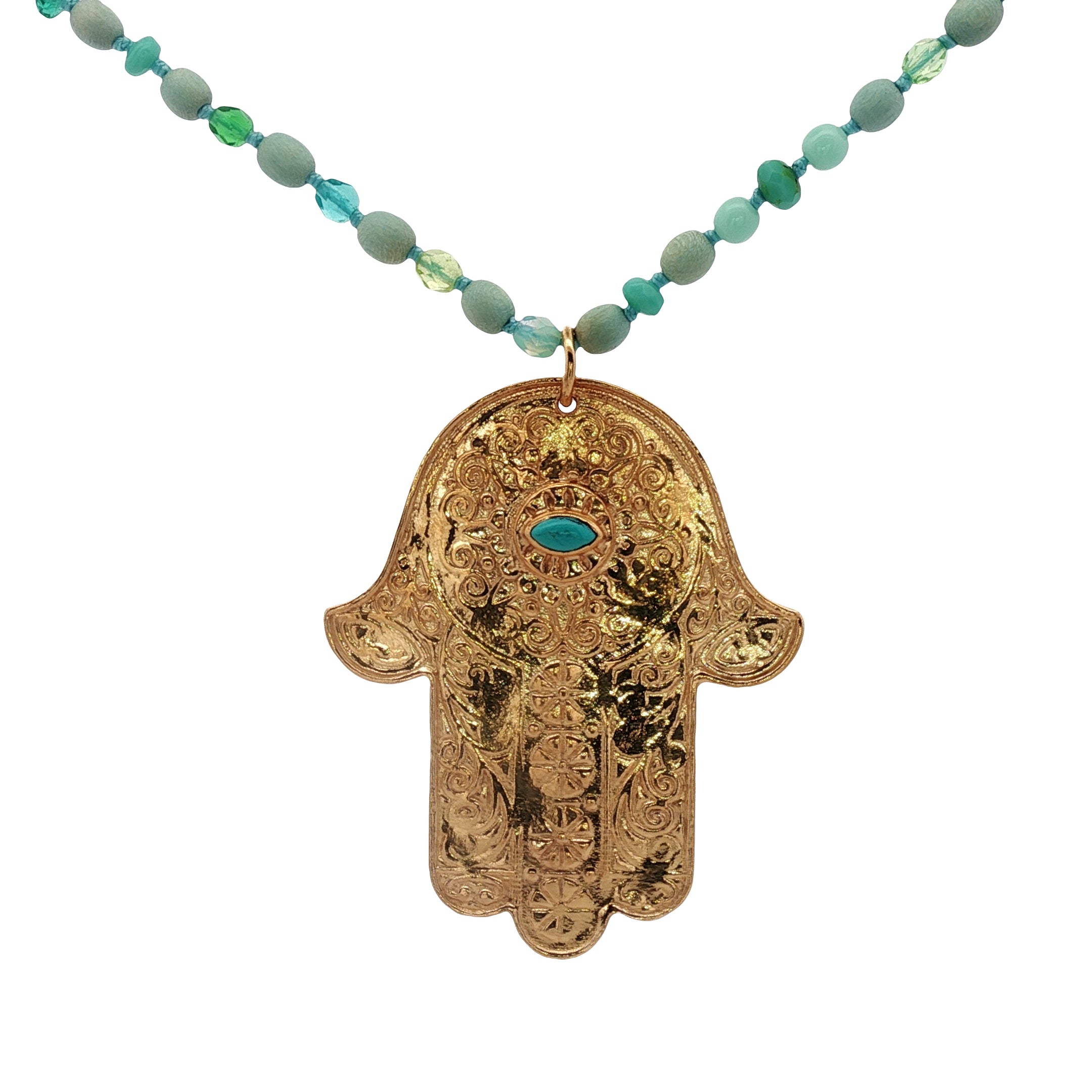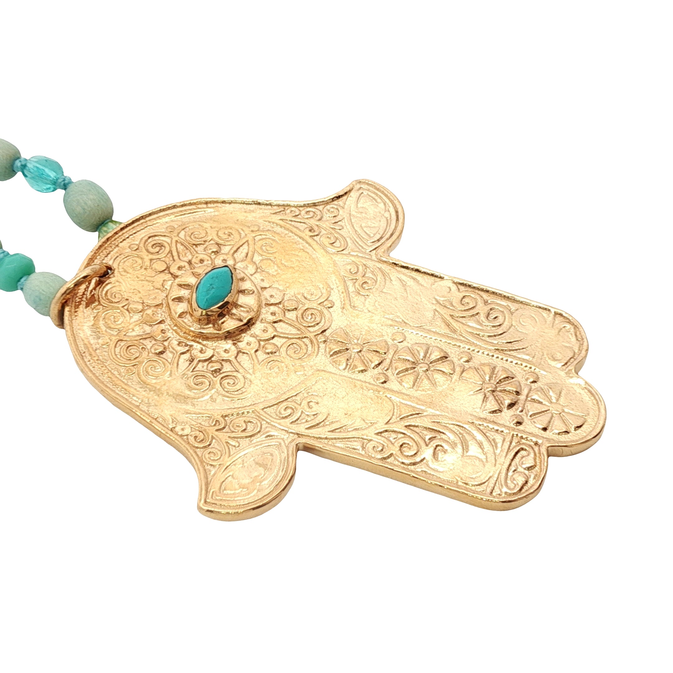 Collier doré main de Fatma gravée avec turquoise et perles vertes 75 cm