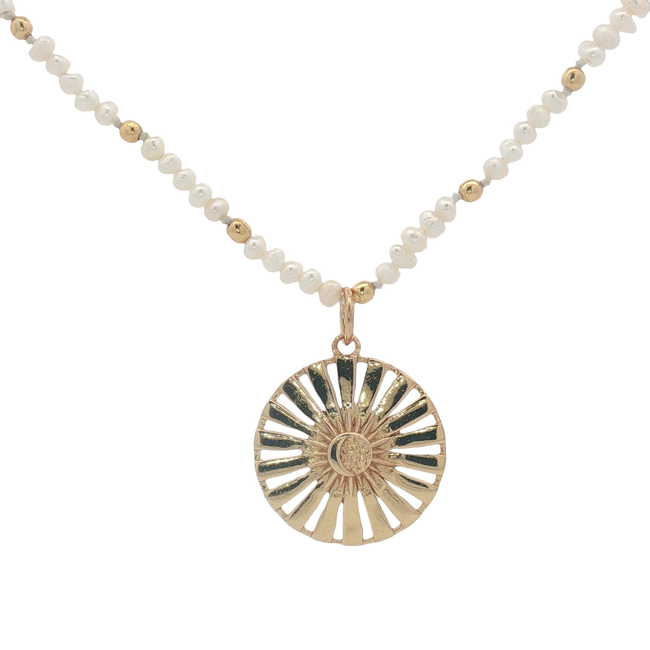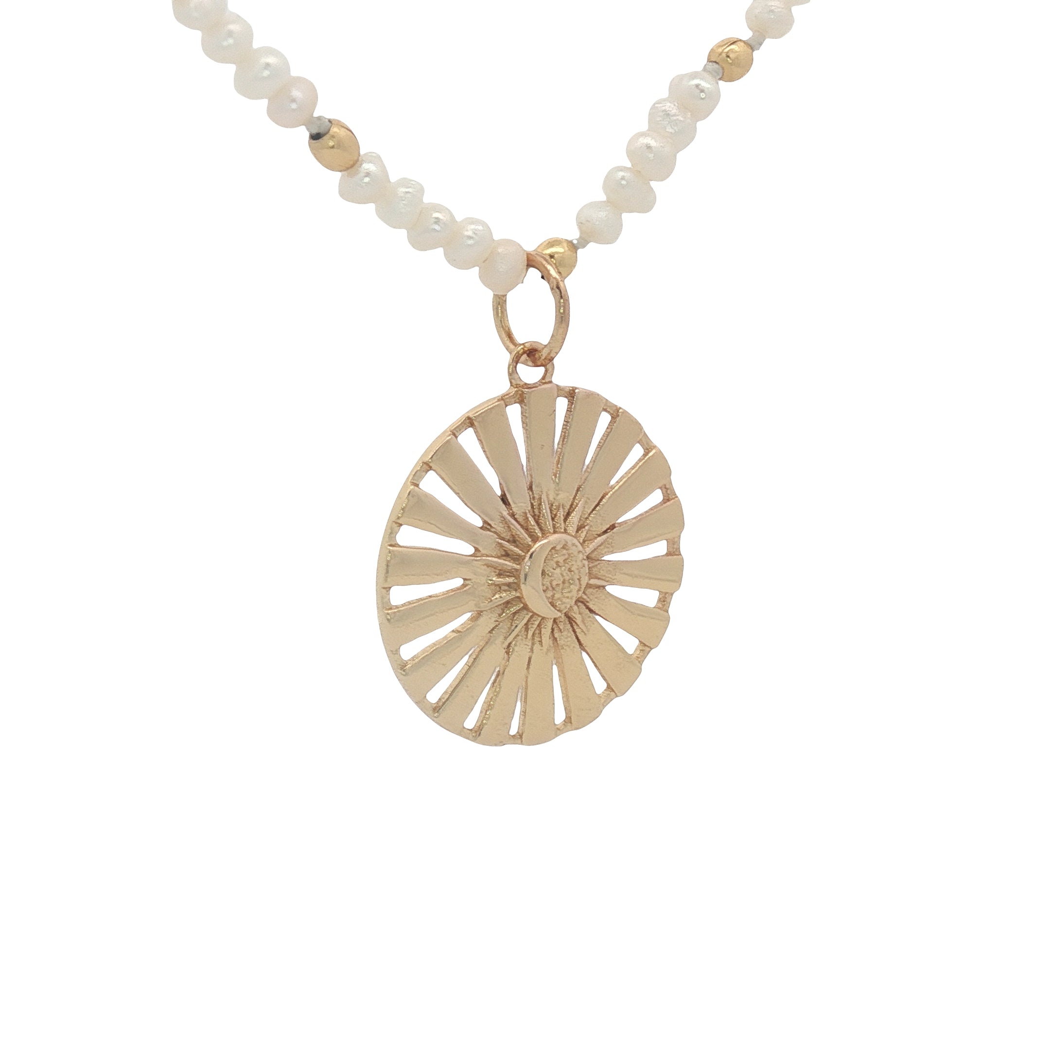 Collier doré médaille soleil et lune perles de culture 42 cm