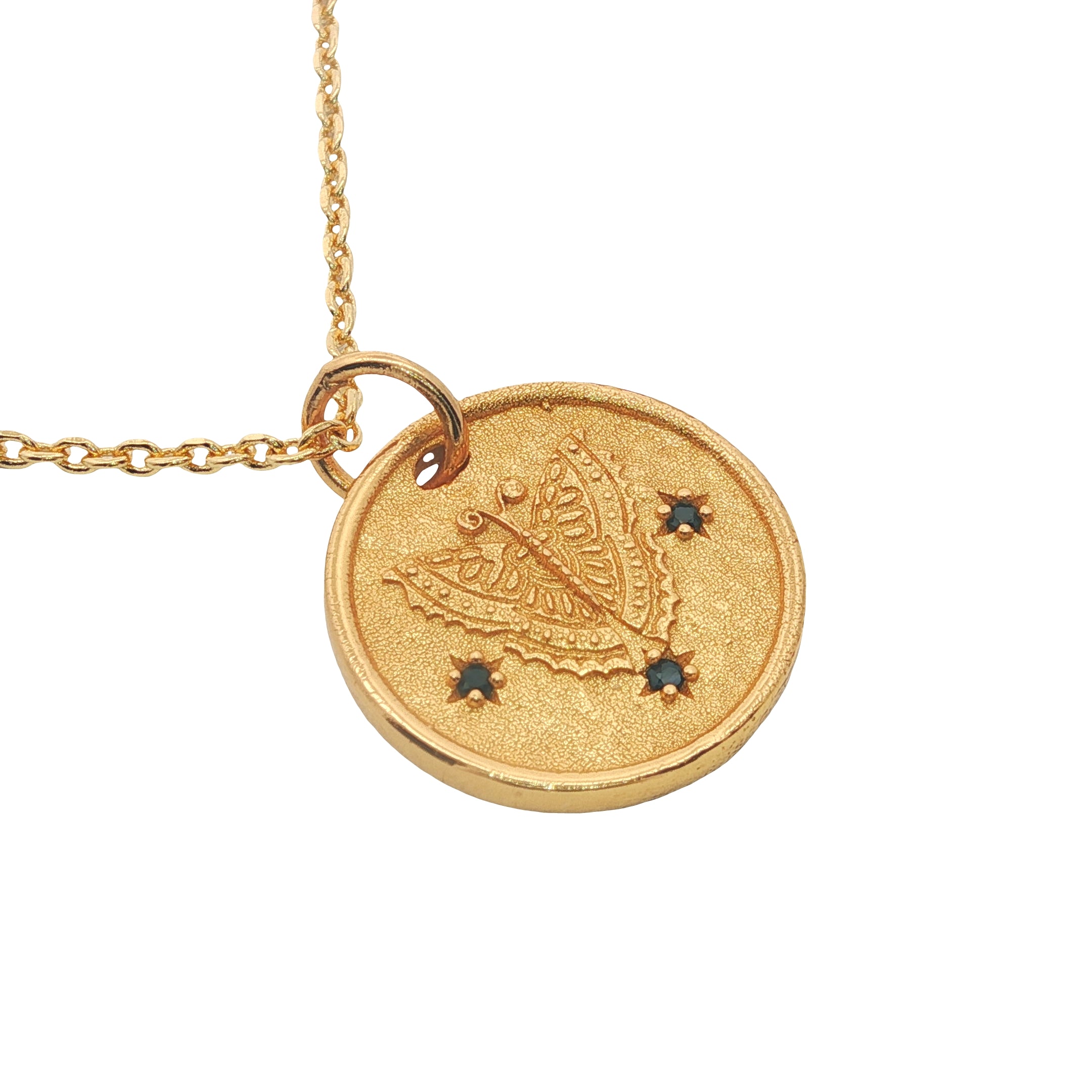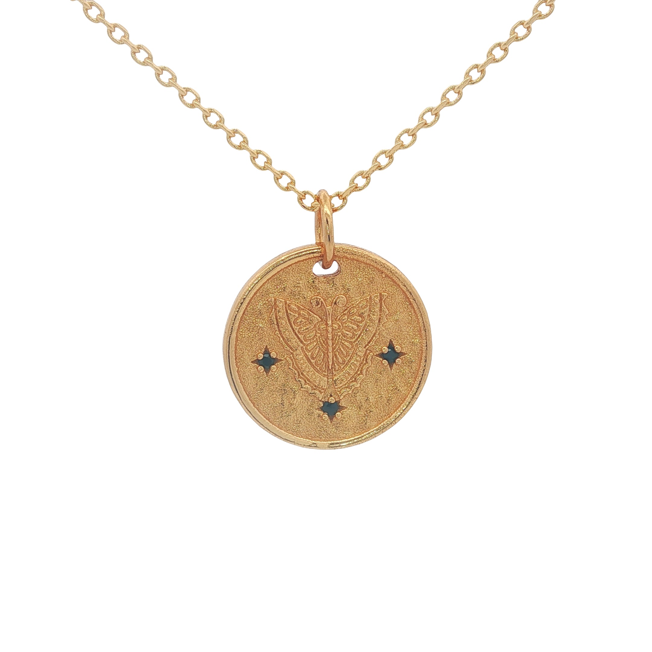Necklace in brass gilded with 18k fine gold and medal engraved with a butterfly and zircons.