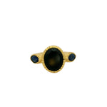 Ring in brass gilded with 18k fine gold and stones. The central stone is oval cut with a chiseled setting. Two different drop-cut stones adorn the sides of the ring.