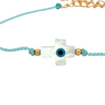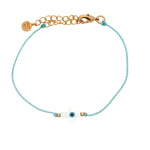 18K fine gold plated chain bracelet with turquoise cord, talismans and mother-of-pearl