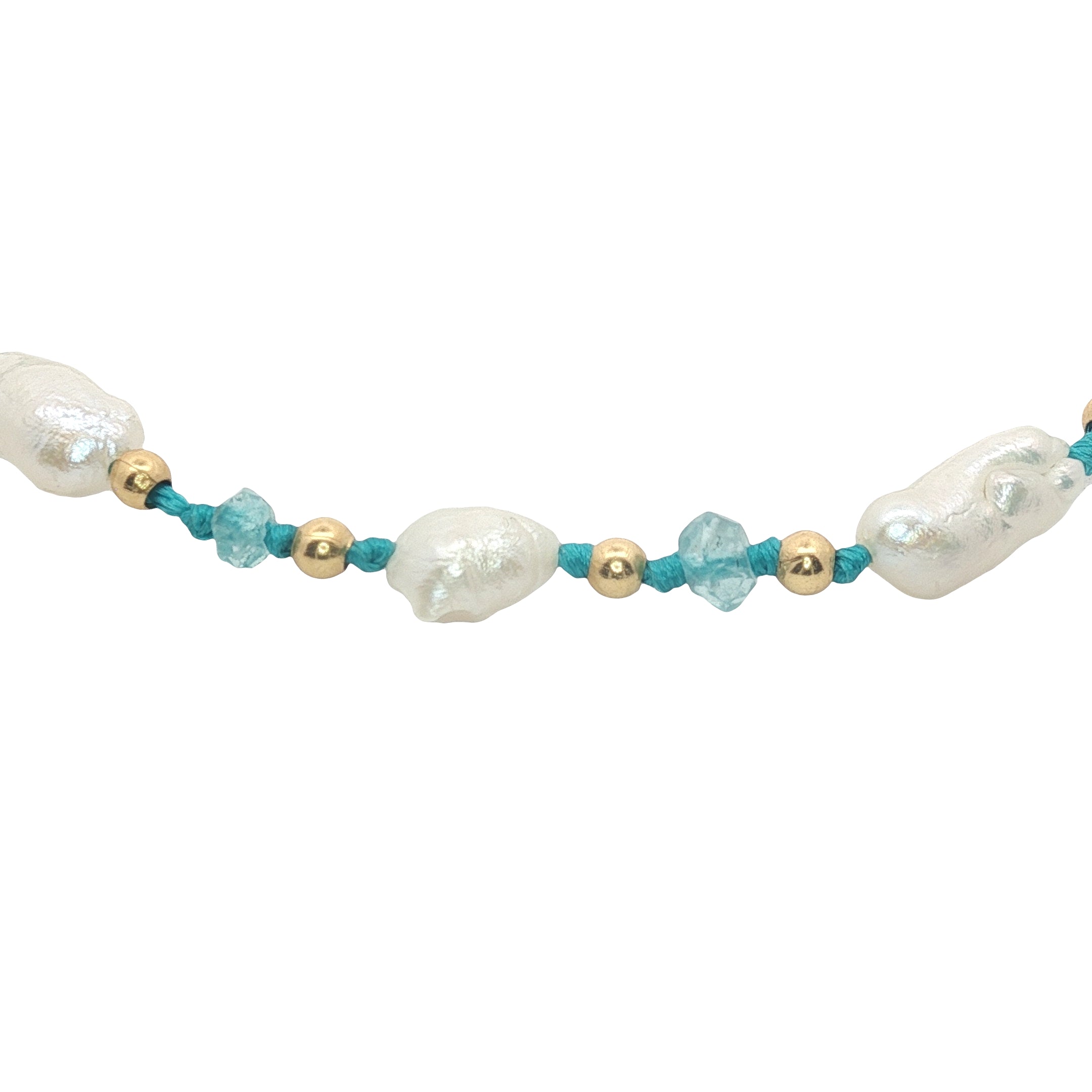 Bracelet avec alternance de perles de culture irrégulières, perles dorées, apatite et noeuds turquoise