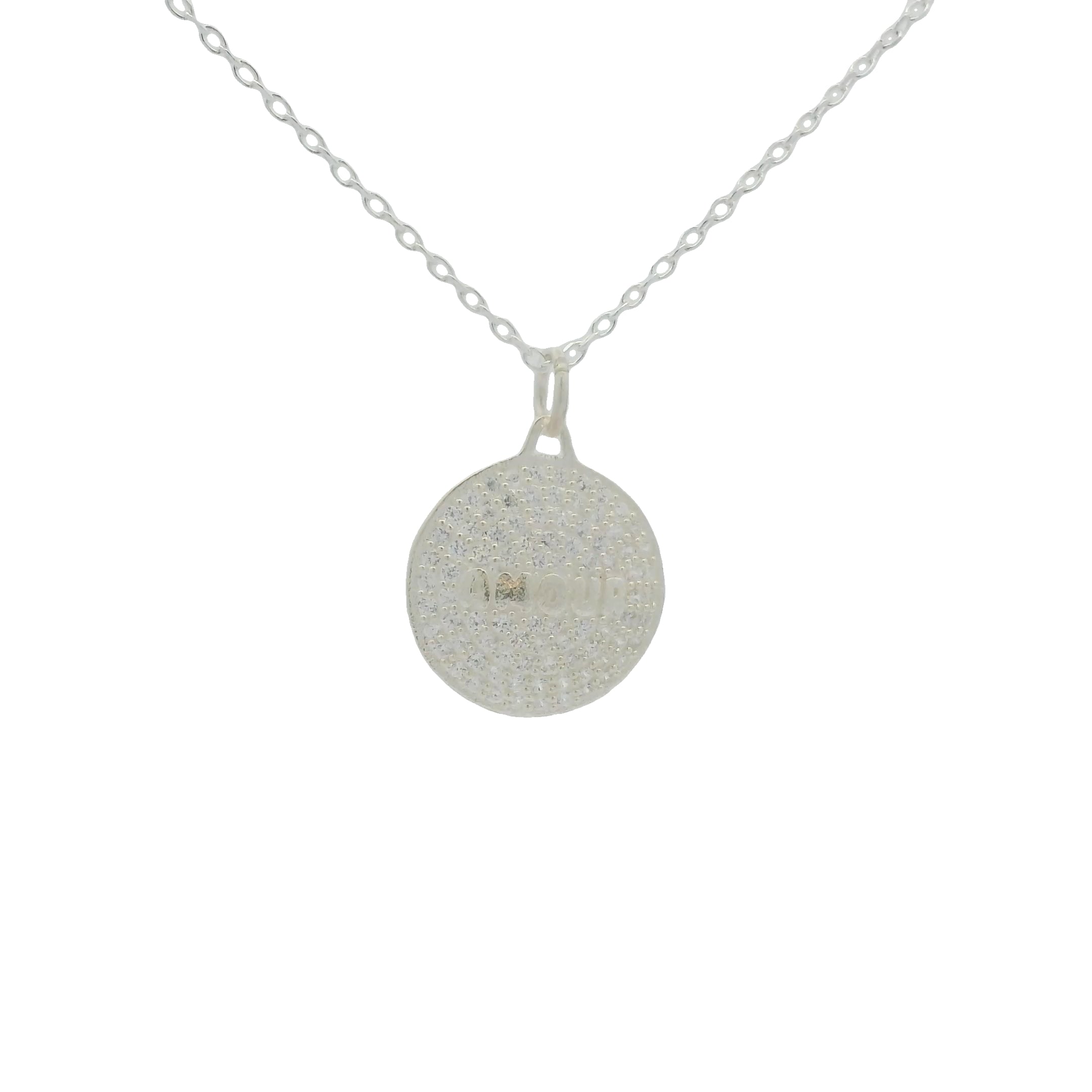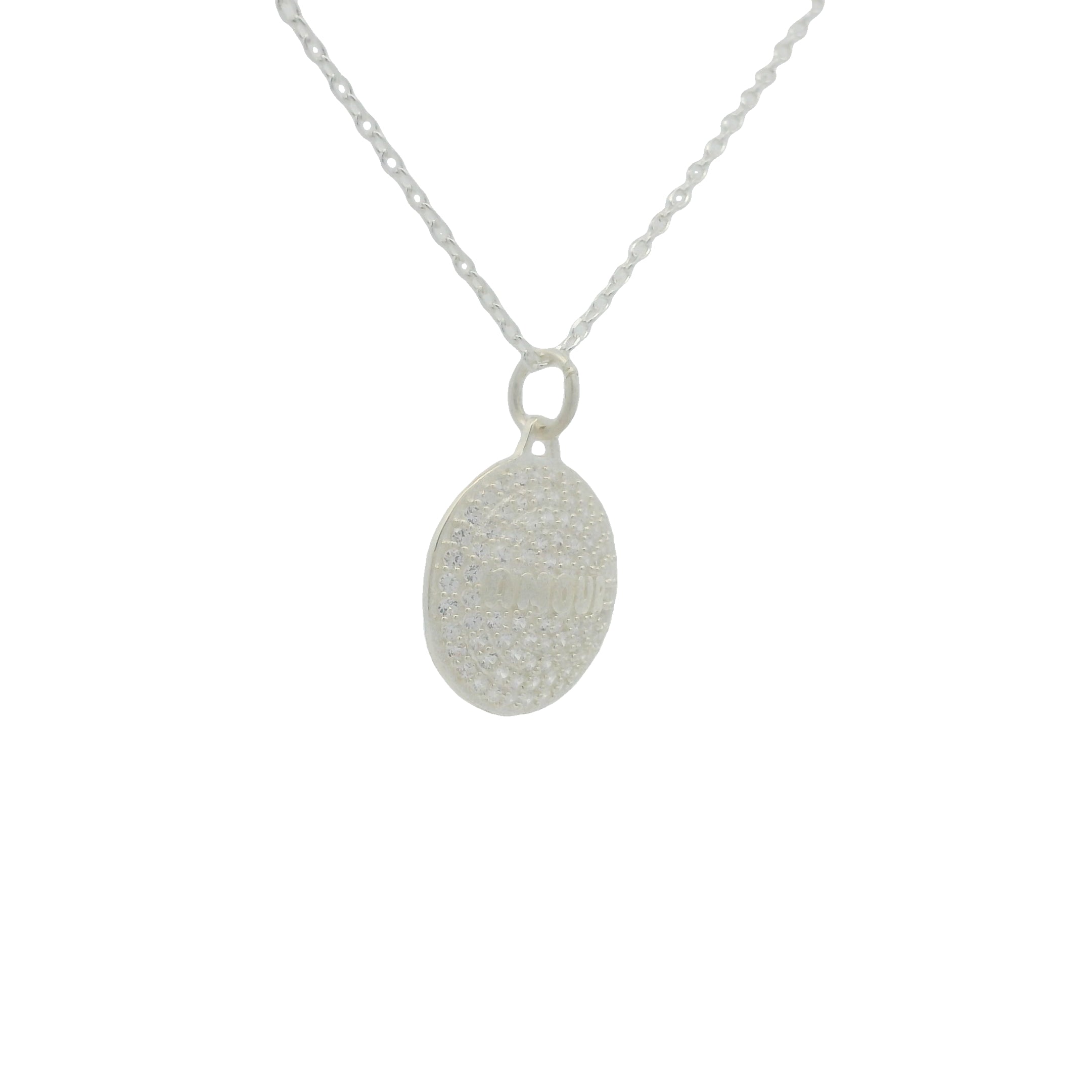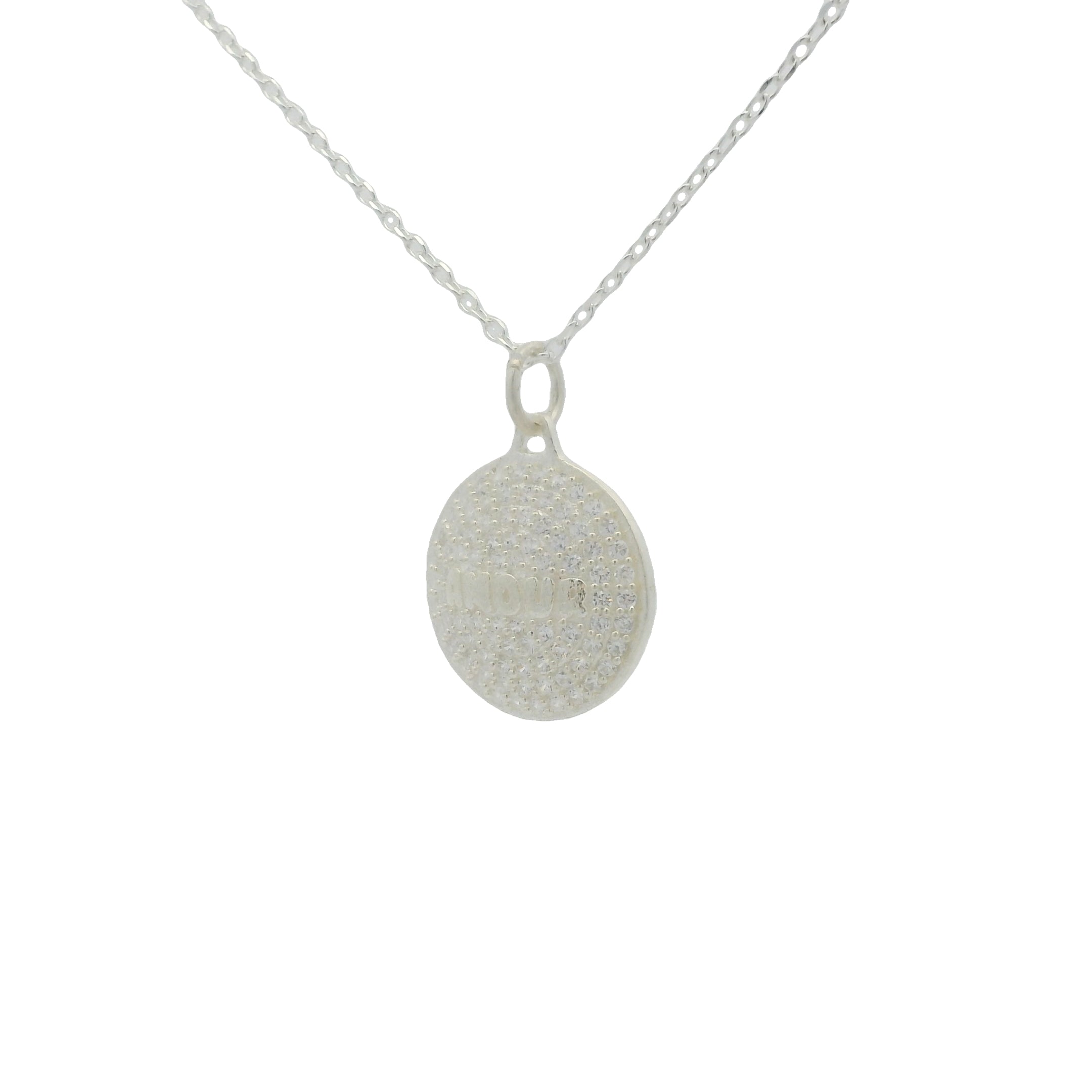 Domed medal set with white zircons. The word "love" is inscribed in the center.