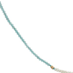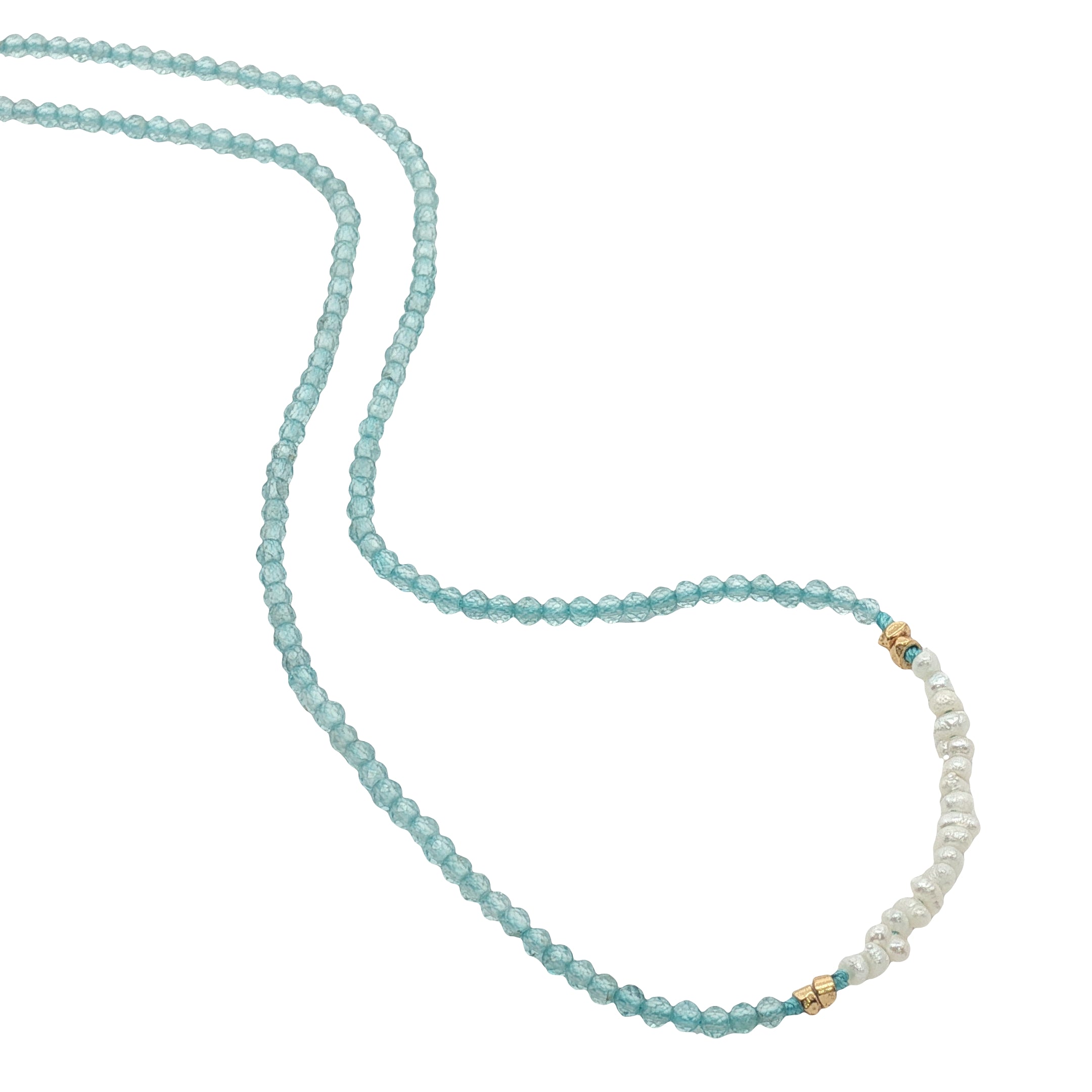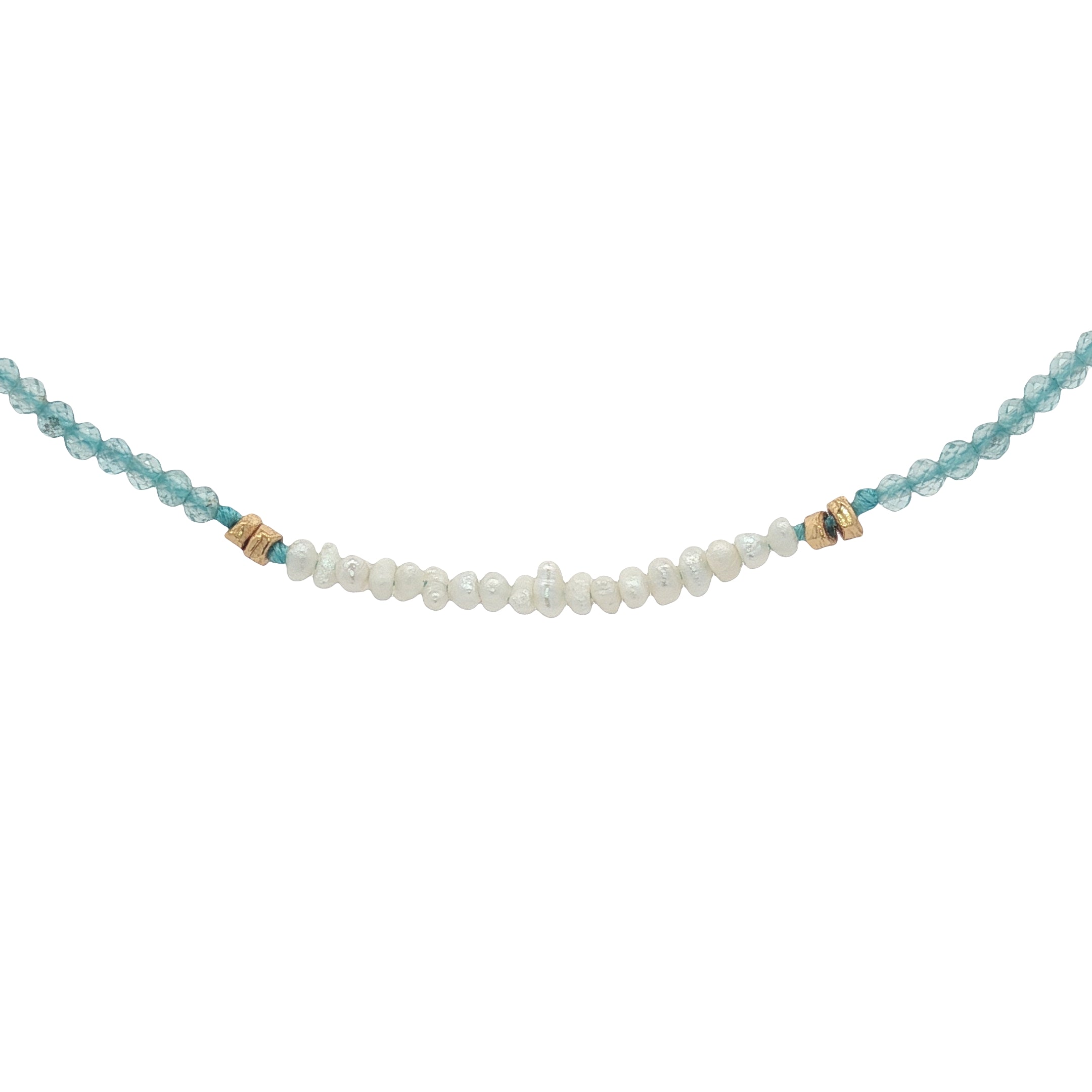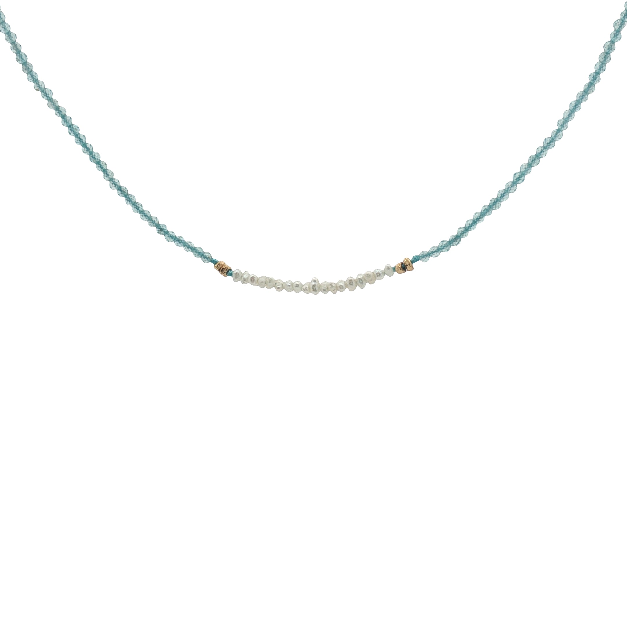 Collier doré en topaze bleue, perles de culture et perles dorées 38 cm
