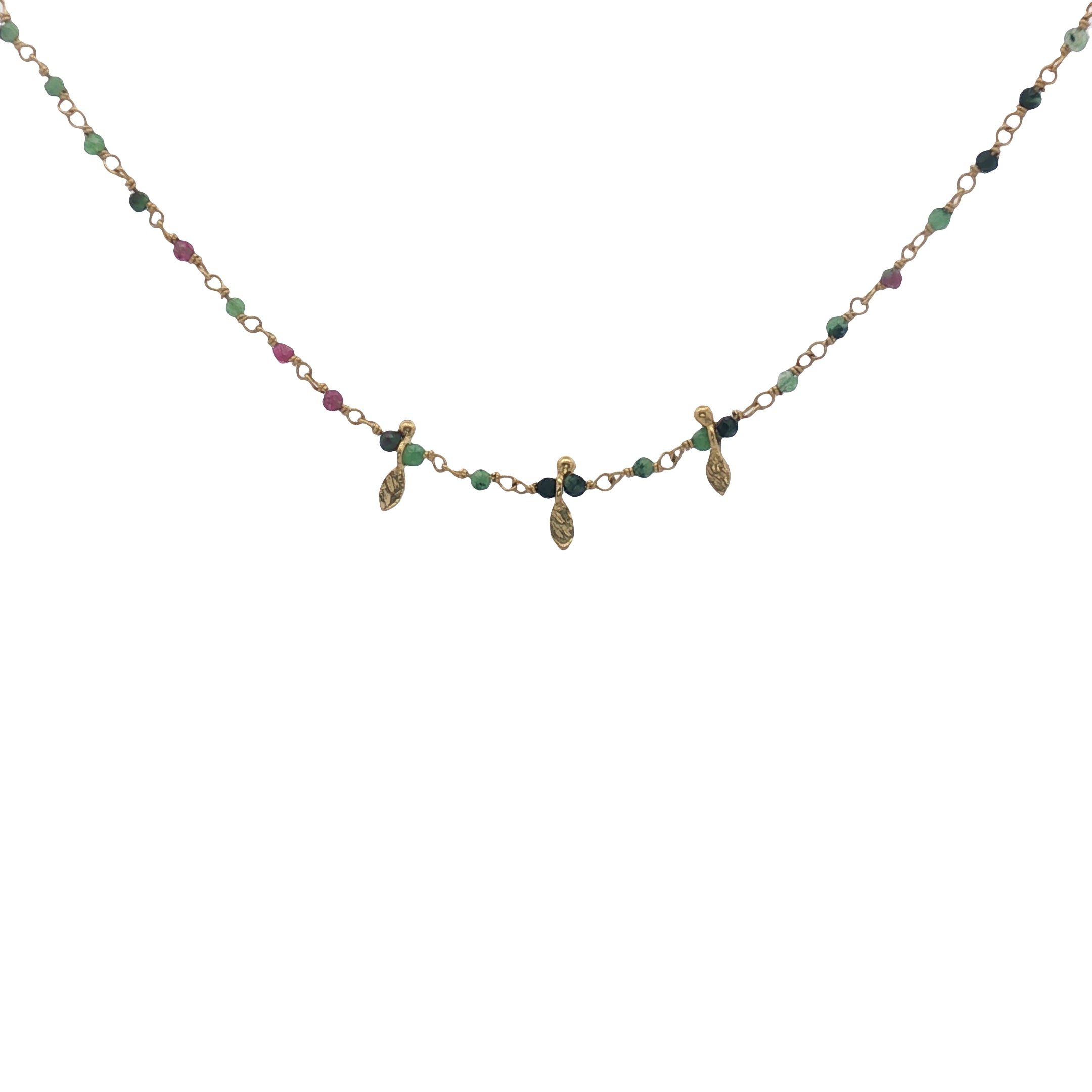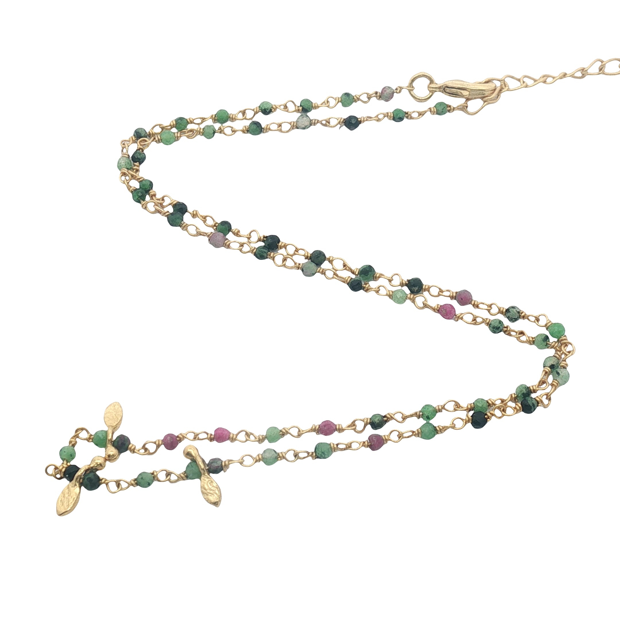 Collier doré chaine rosary en rubis zoisite et pampilles navette 42 cm