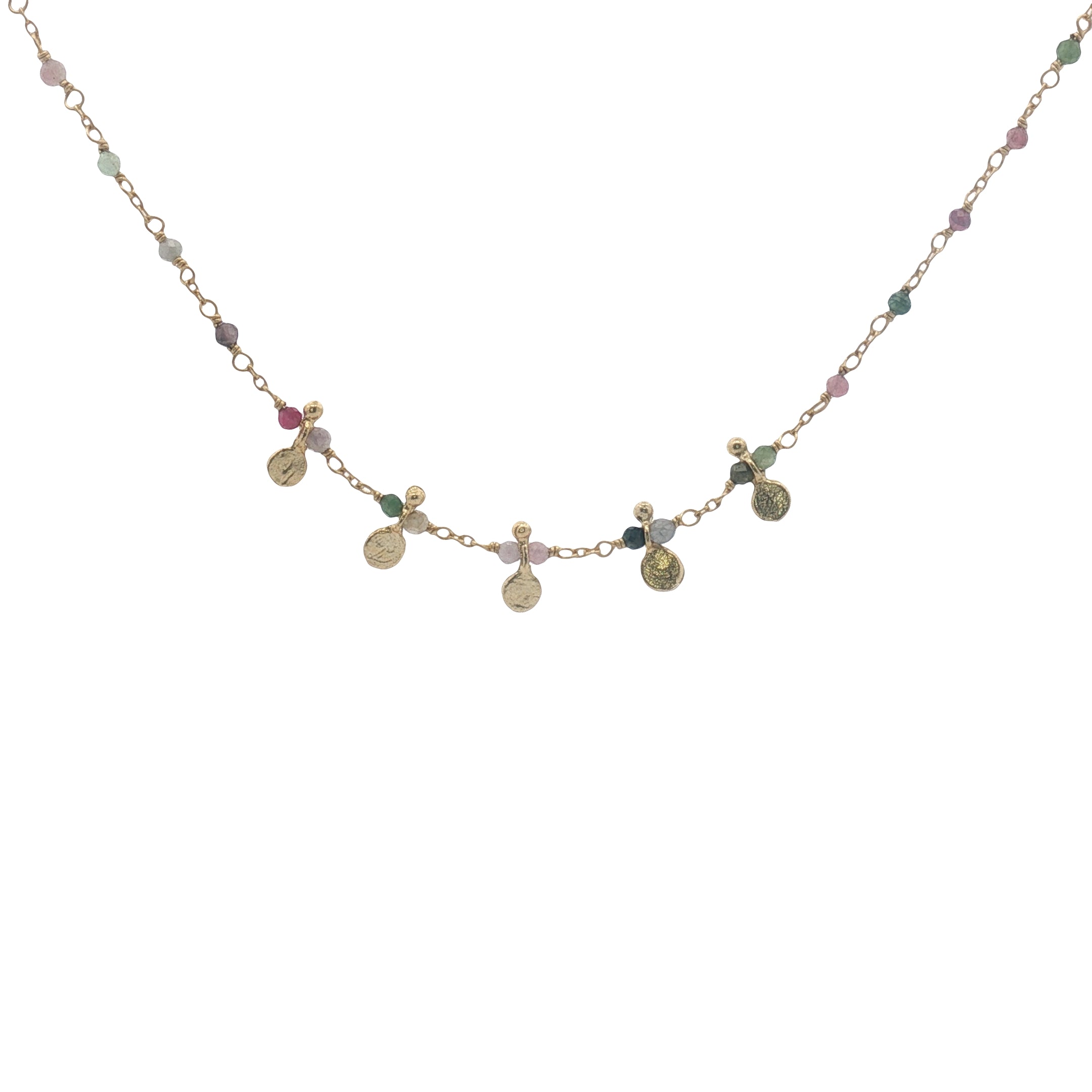 Cinq pampilles rondes dorées martelées espacées au centre du collier