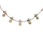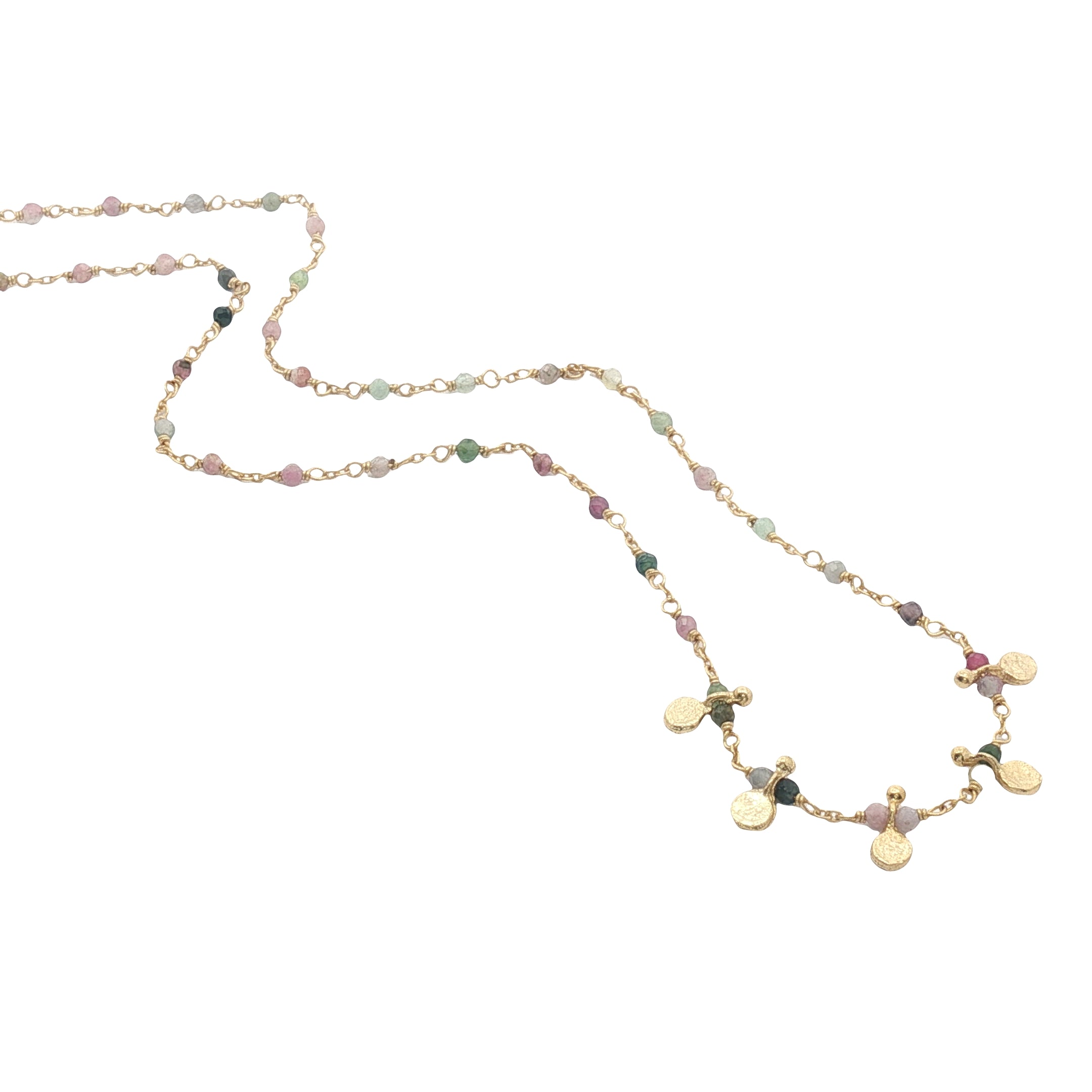 Collier doré chaine rosary en tourmaline 5 pampilles dorées 50 cm