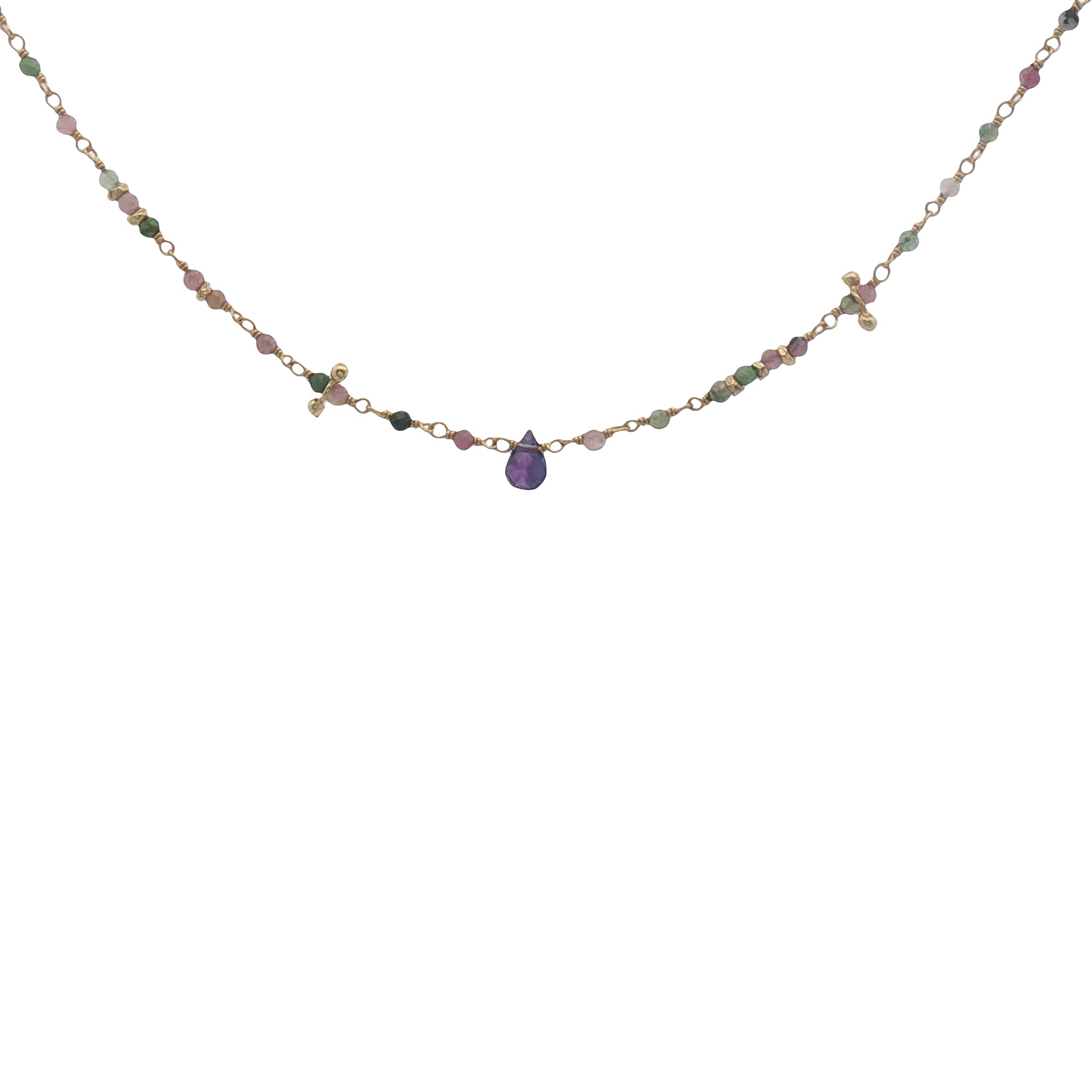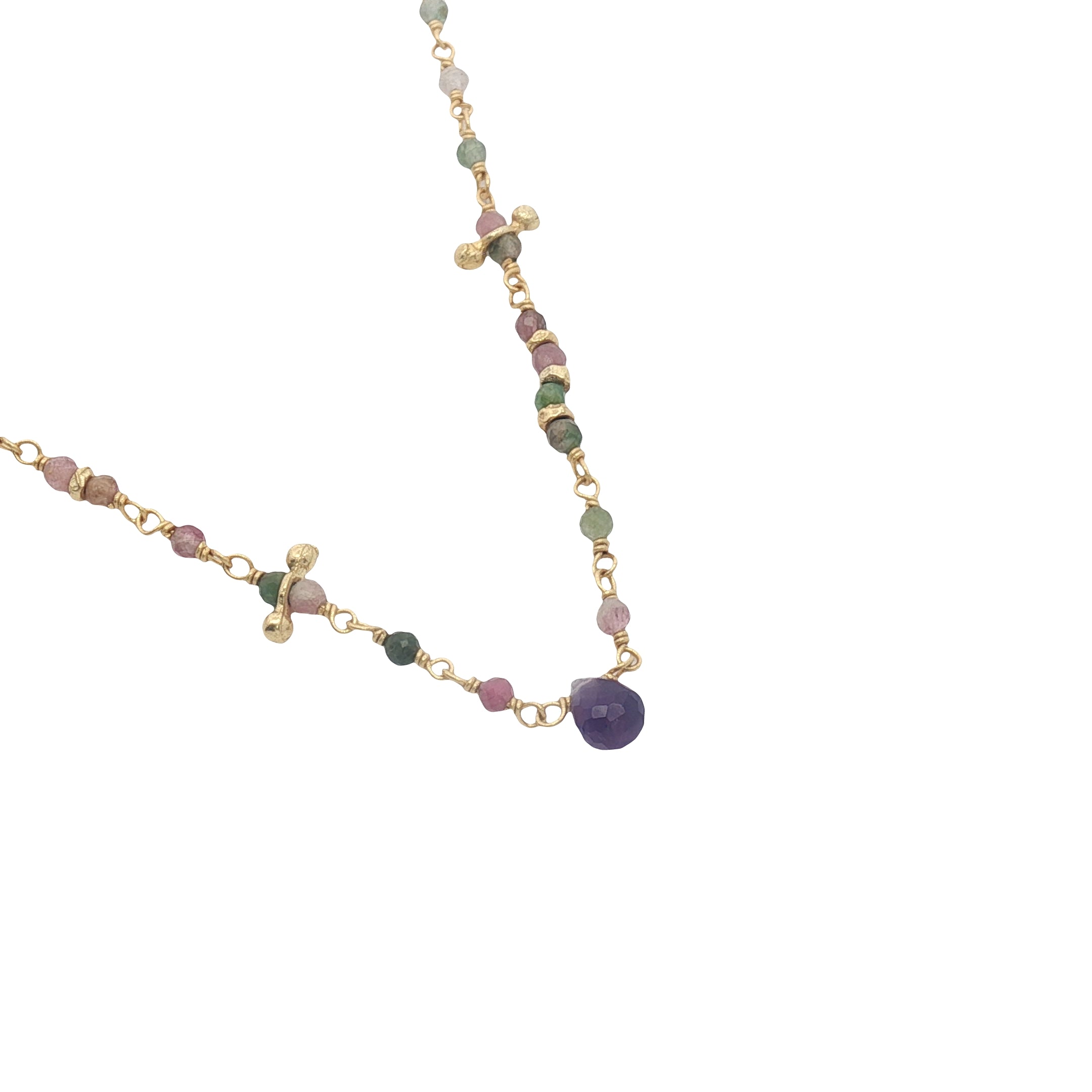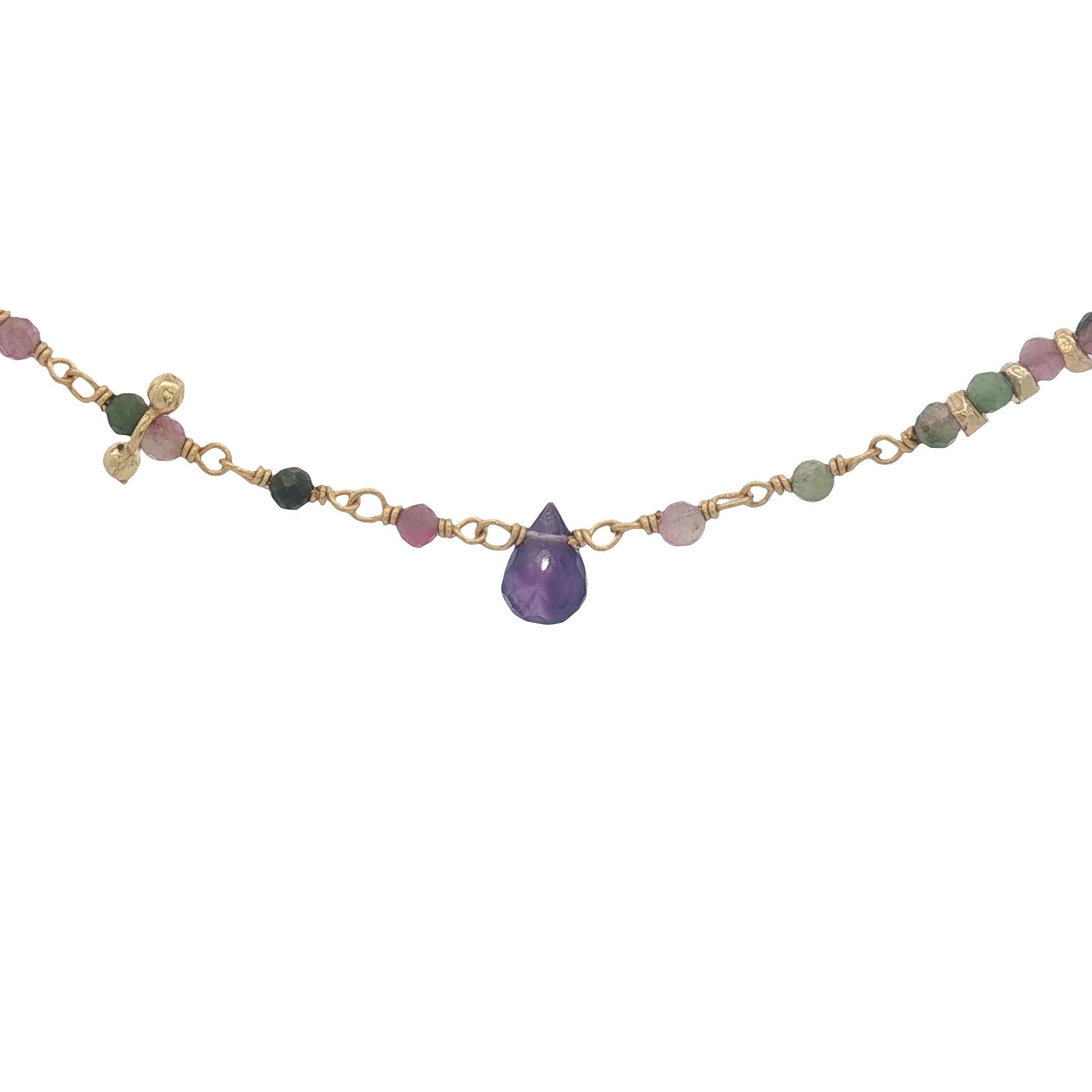 Collier doré chaine rosary en tourmaline goutte en améthyste 42 cm