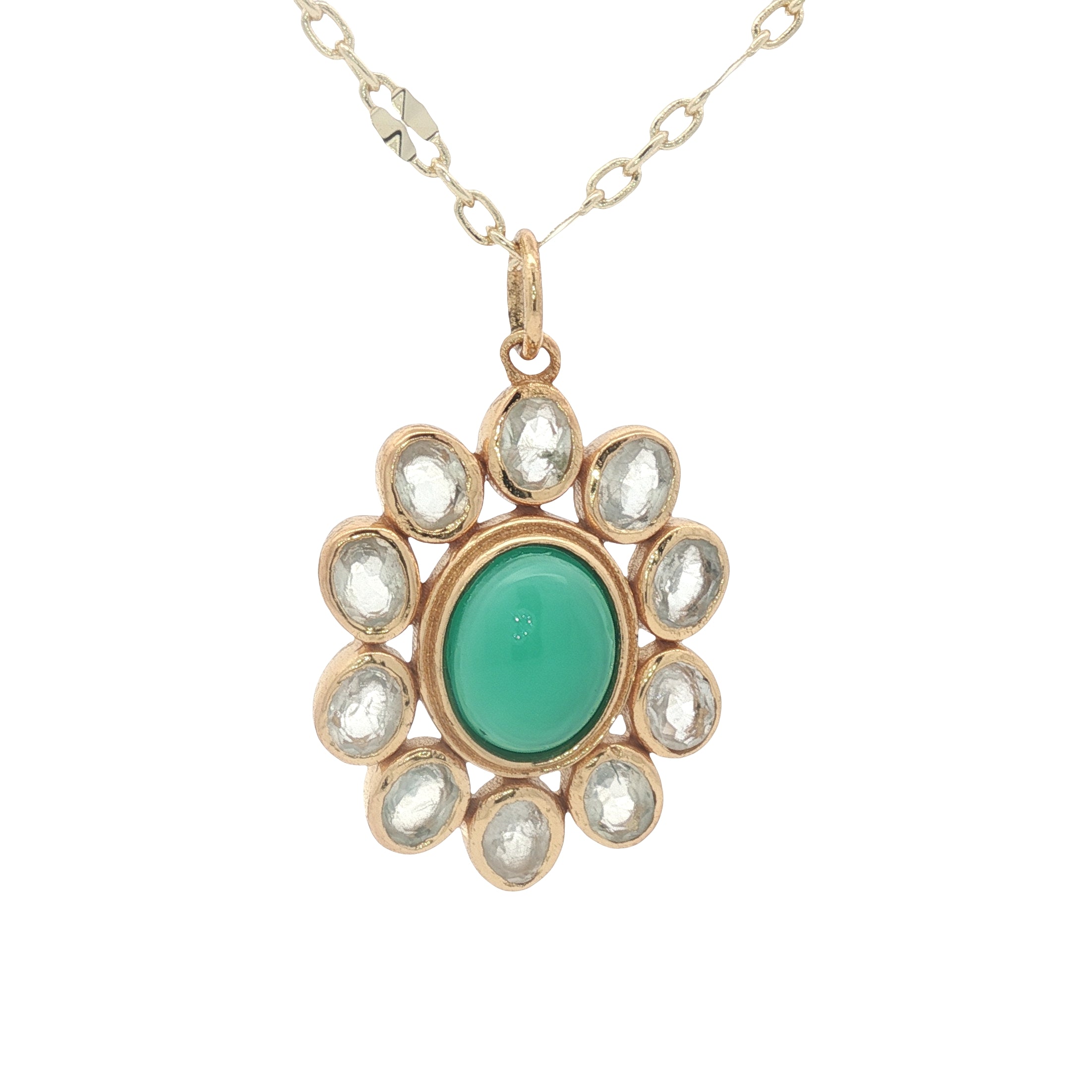 Pendentif fleur avec prehnite et onyx verte en cabochon : 22 mm x 18 mm