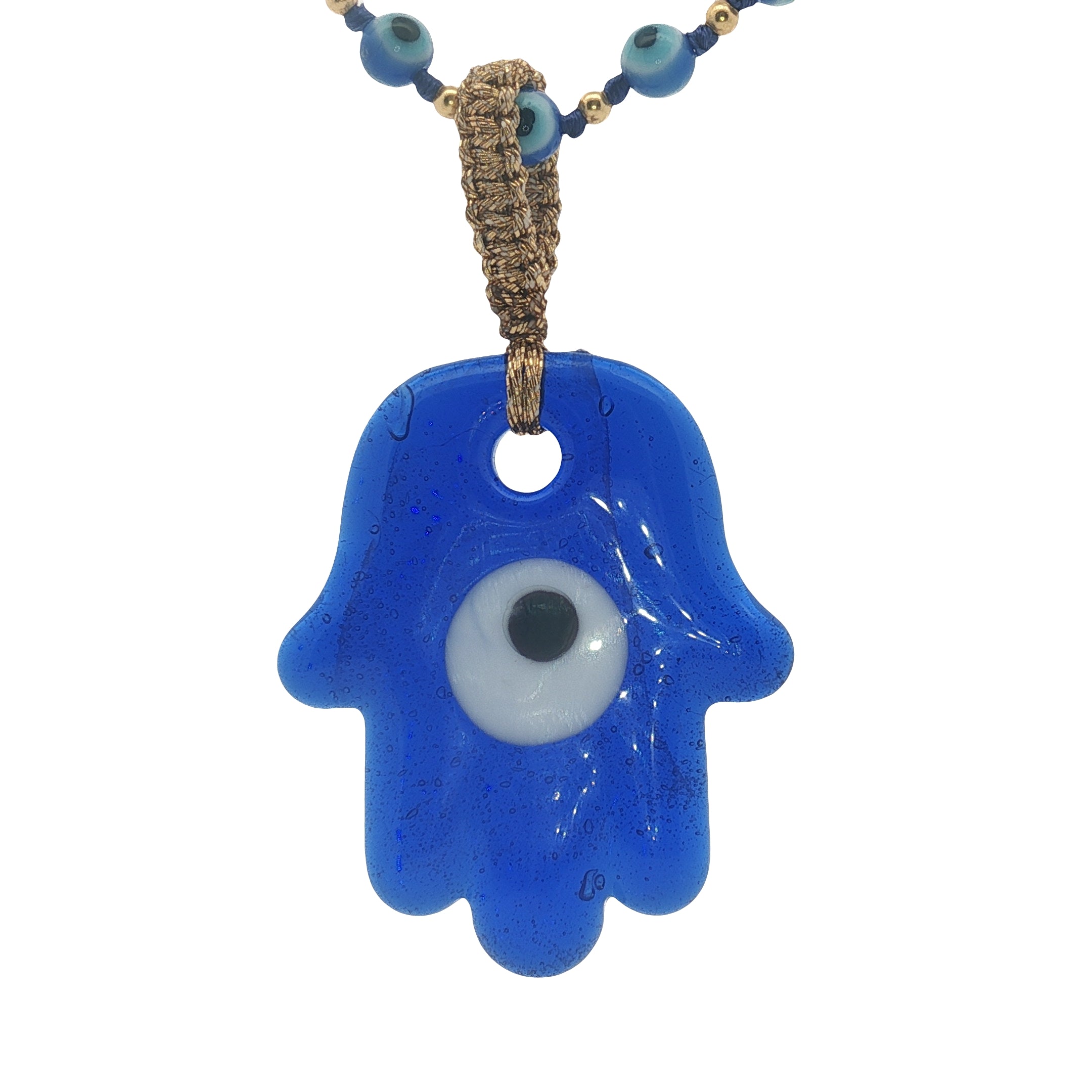 Pendentif main de Fatma en verre soufflé bleu : 51 mm x 28 mm