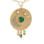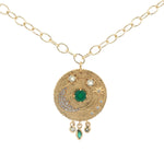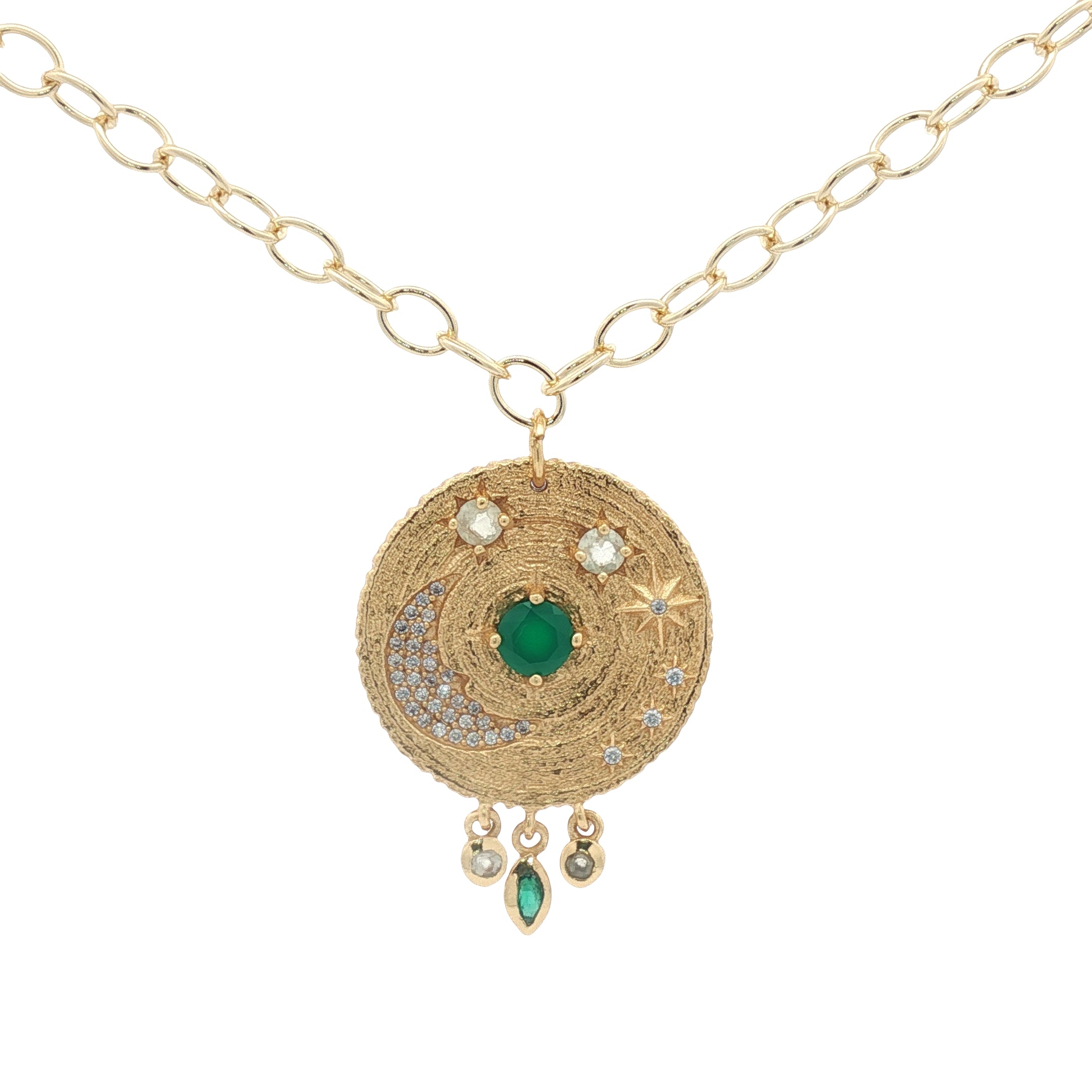 Collier doré médaillon astres en onyx verte, prehnite et zircons avec pampilles 60 cm