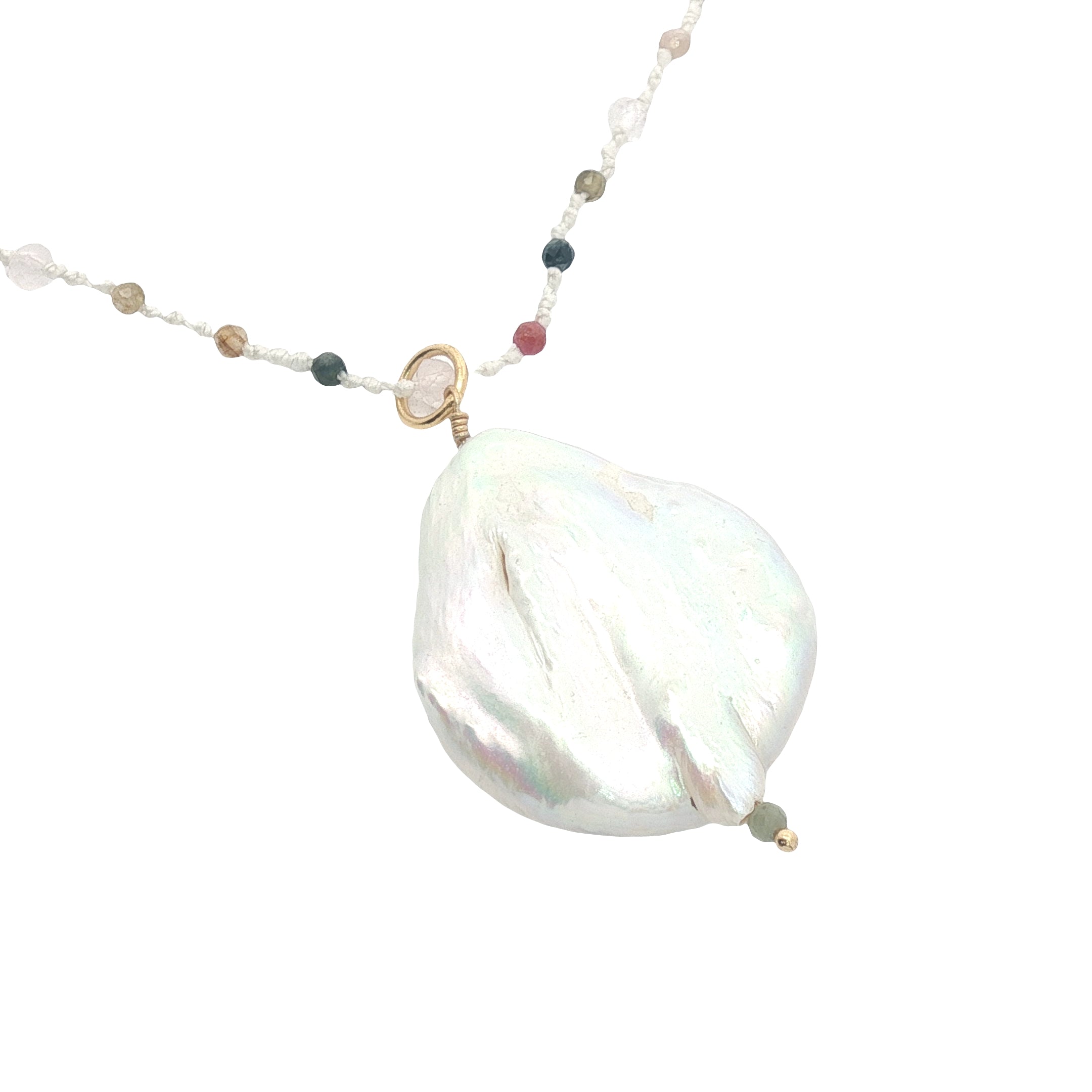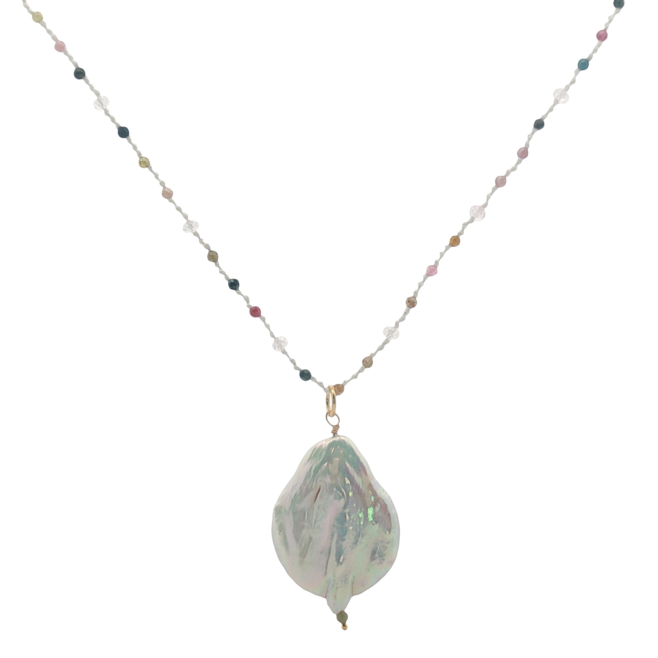 Collier doré nacre blanche, tourmaline et quartz rose 60 cm