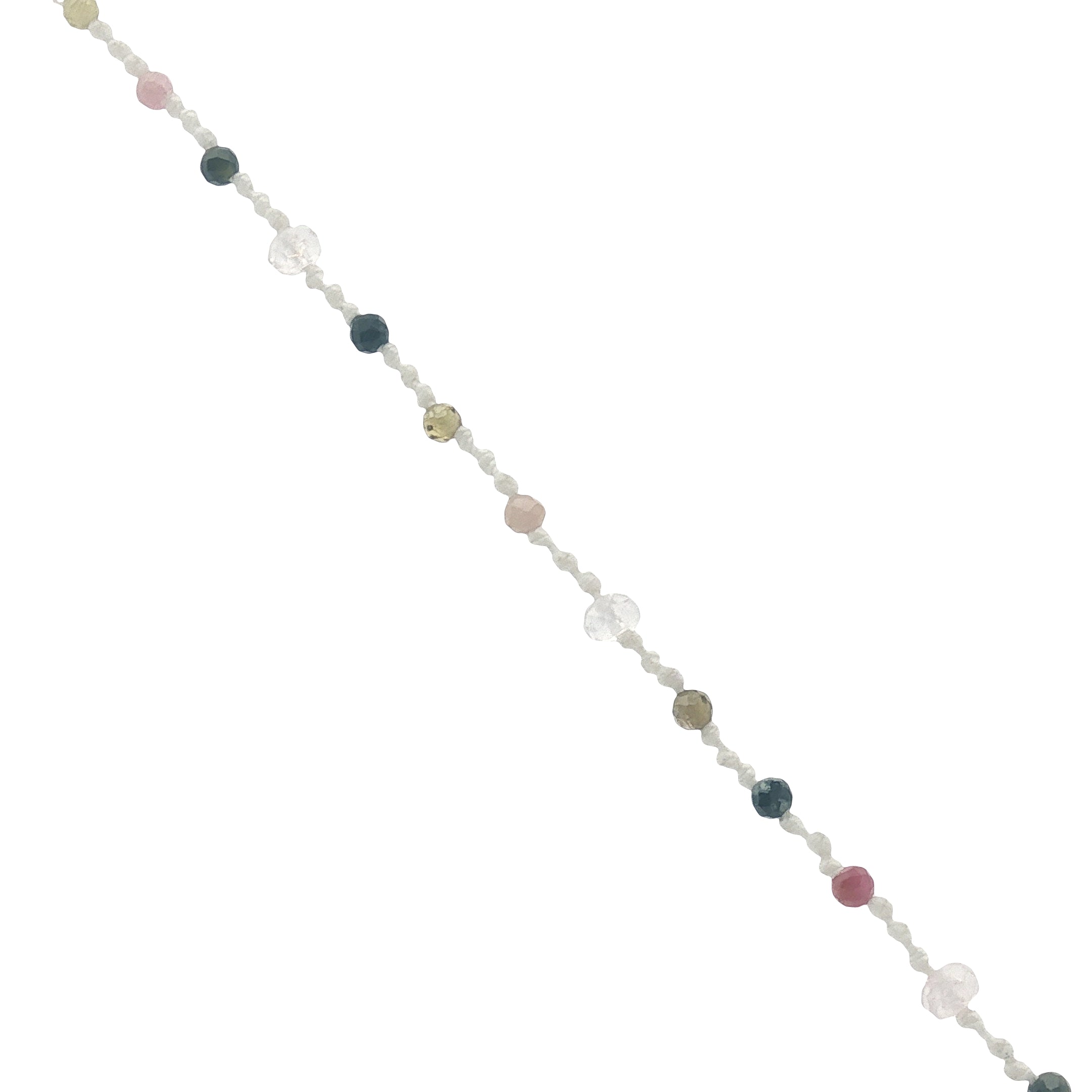 Collier avec pierres en tourmaline et quartz rose espacées par des noeuds blancs