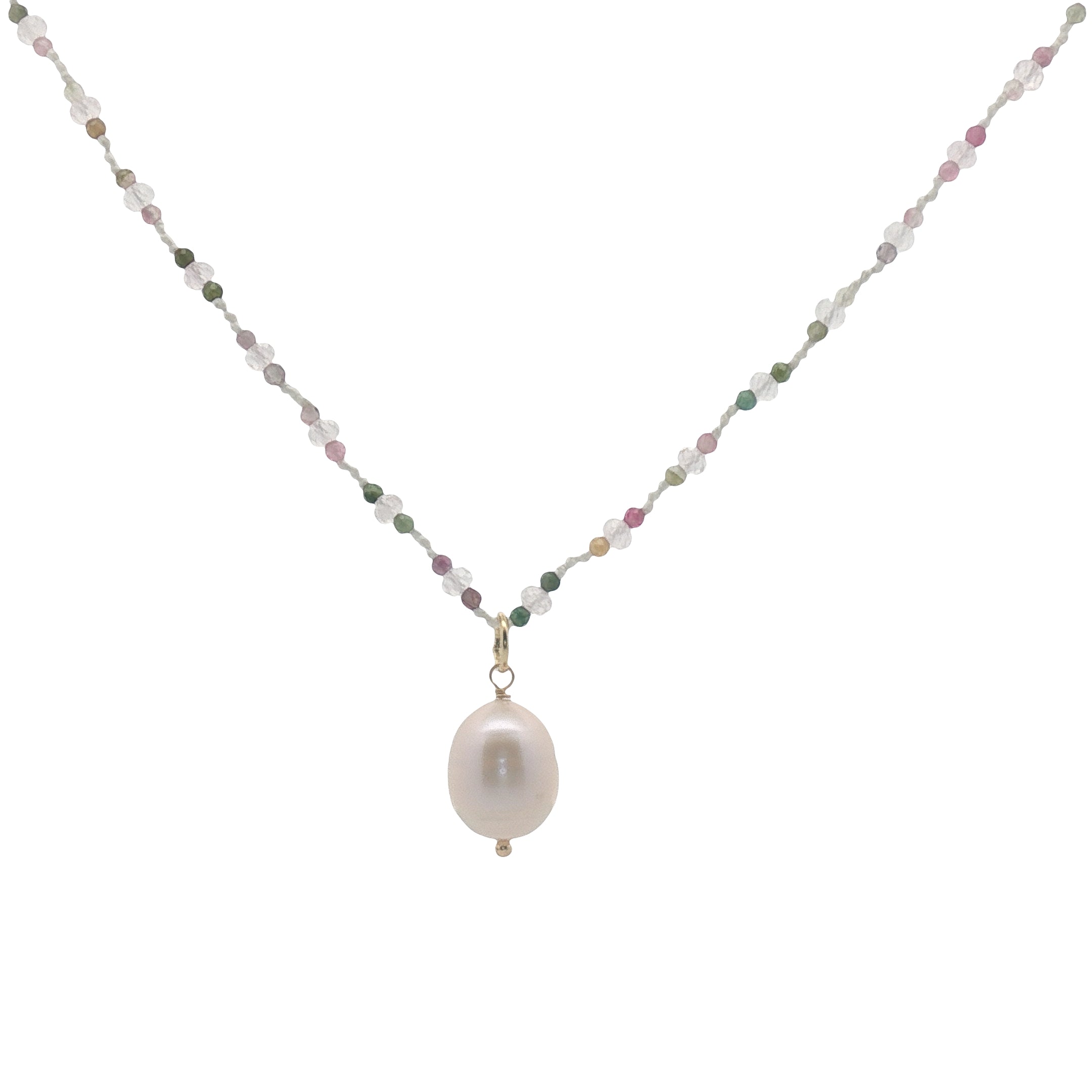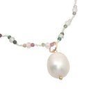 Collier doré perle de culture, tourmaline et quartz rose 60 cm
