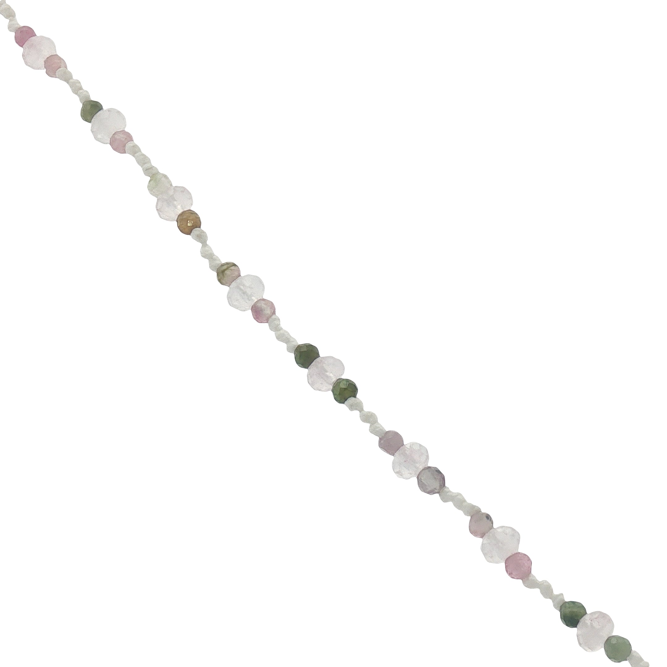 Collier avec pierres en tourmaline et quartz rose espacées par des noeuds blancs