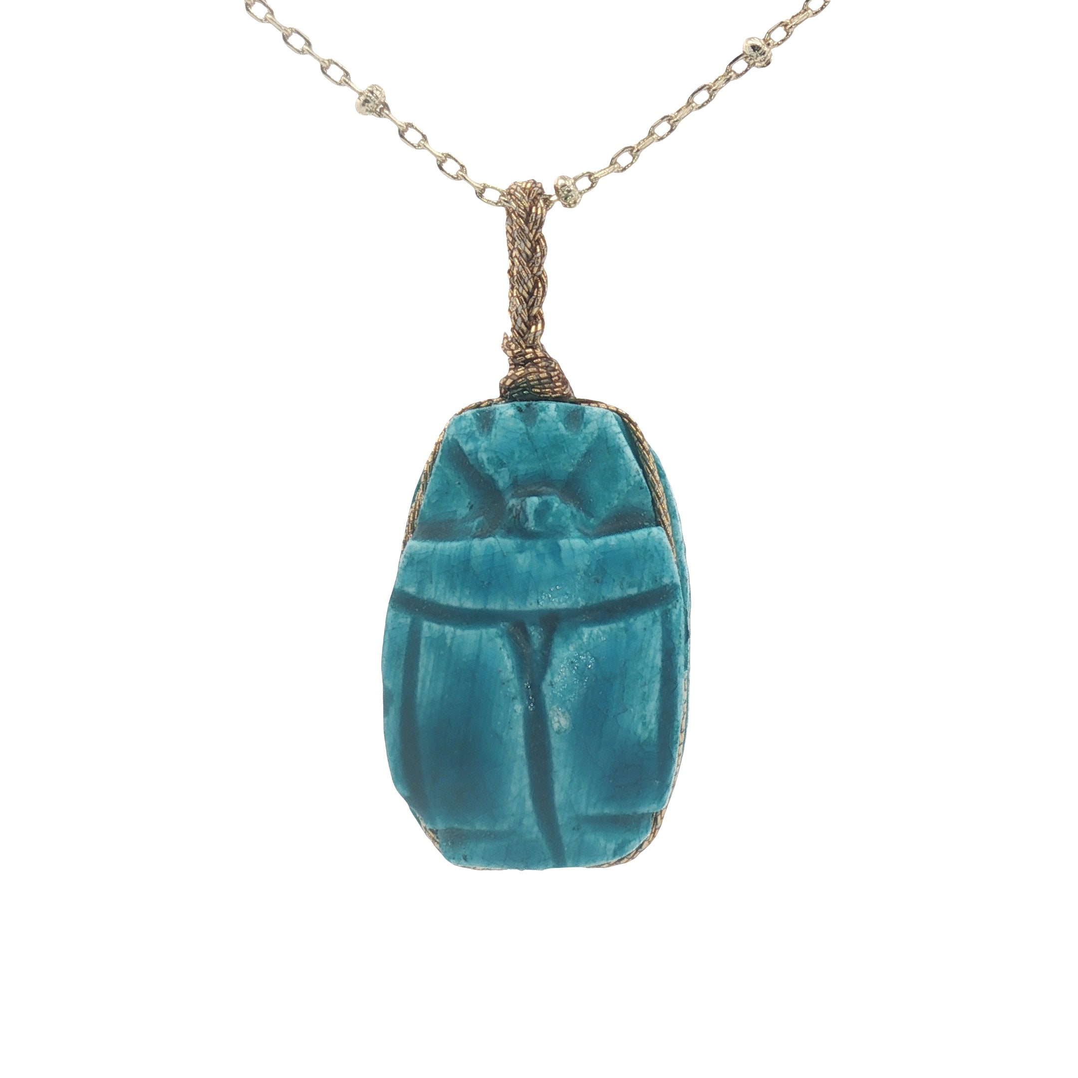Collier doré scarabée en céramique teintée en bleu turquoise 60 cm