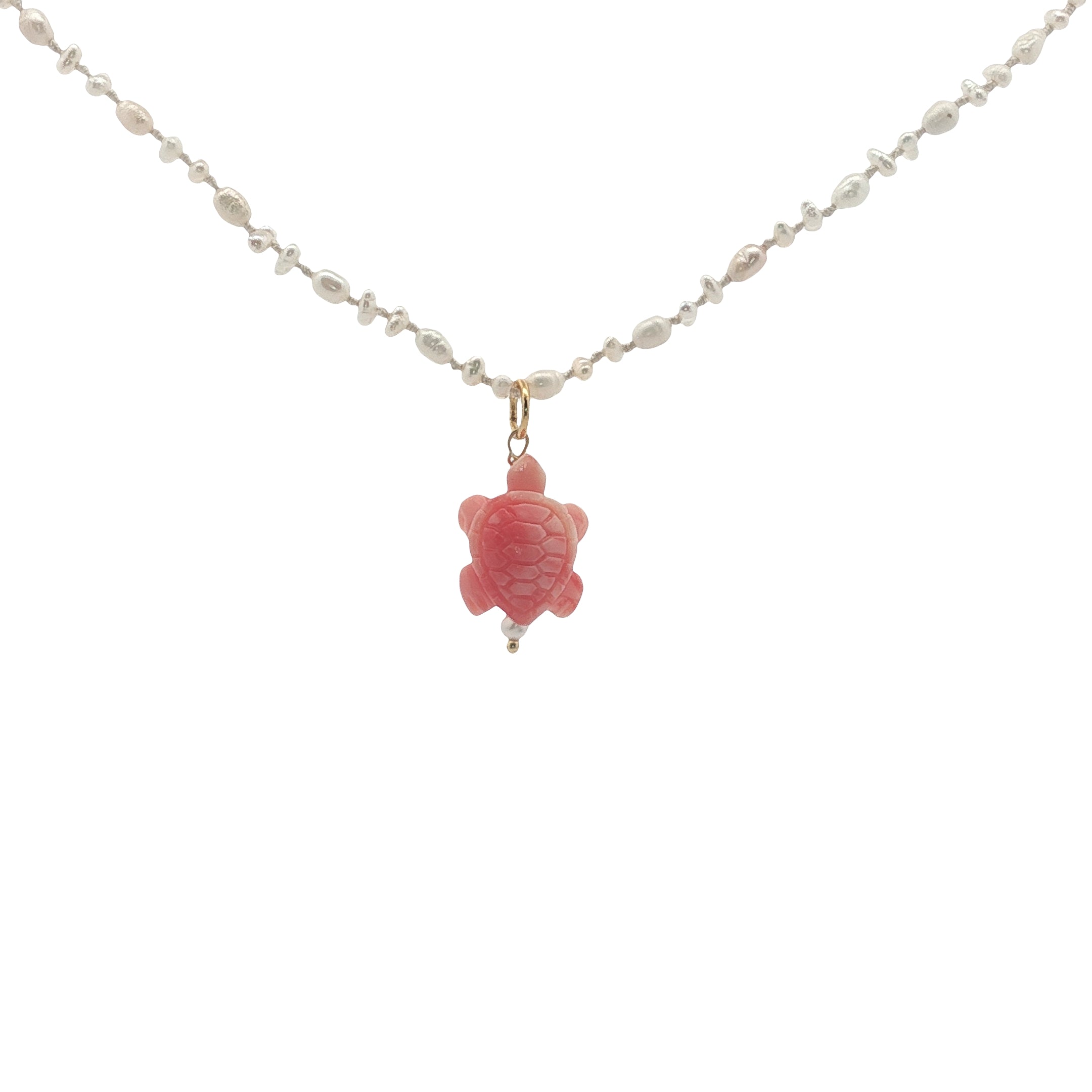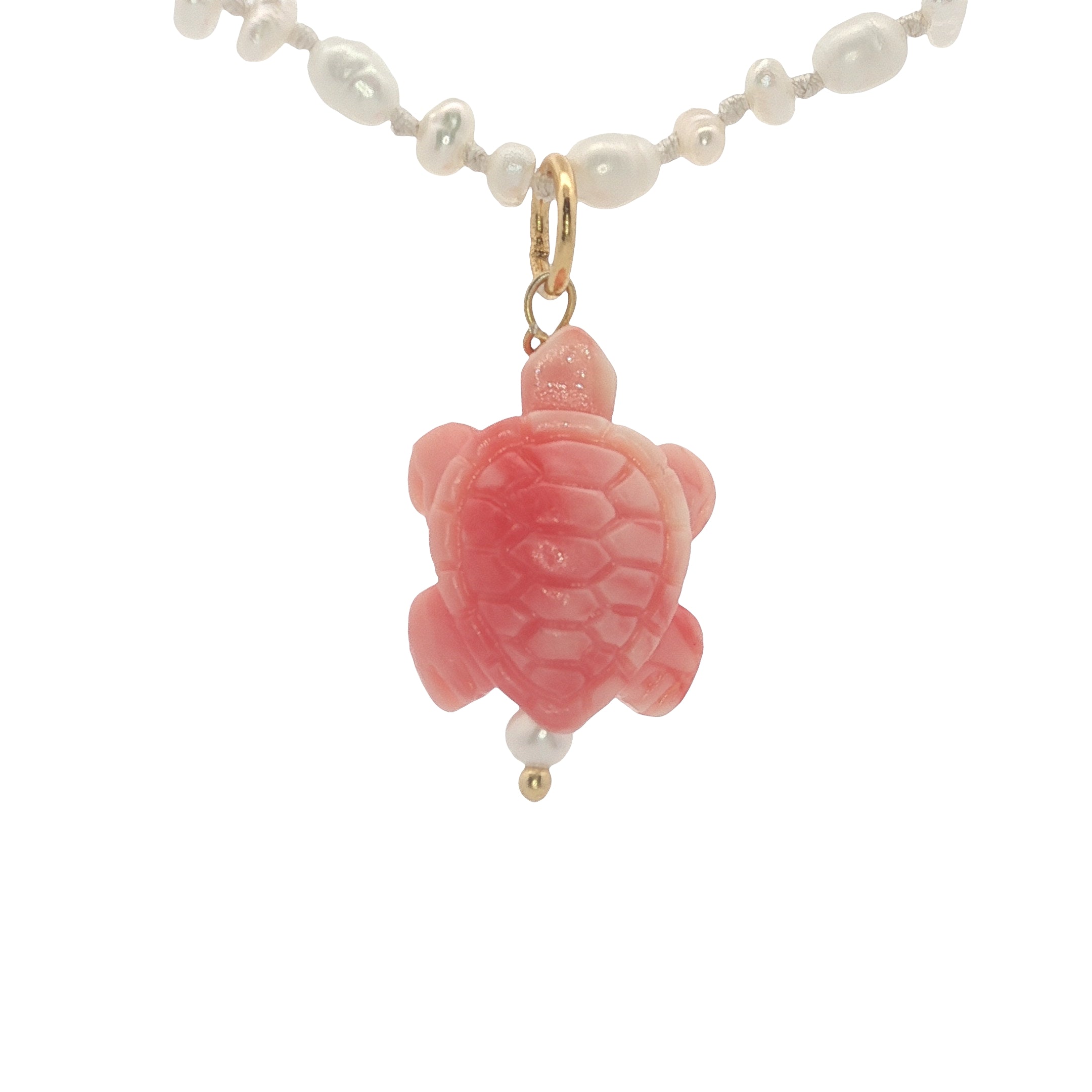 Pendentif tortue rose ornée d'une petite perle de culture : 18 mm x 11 mm