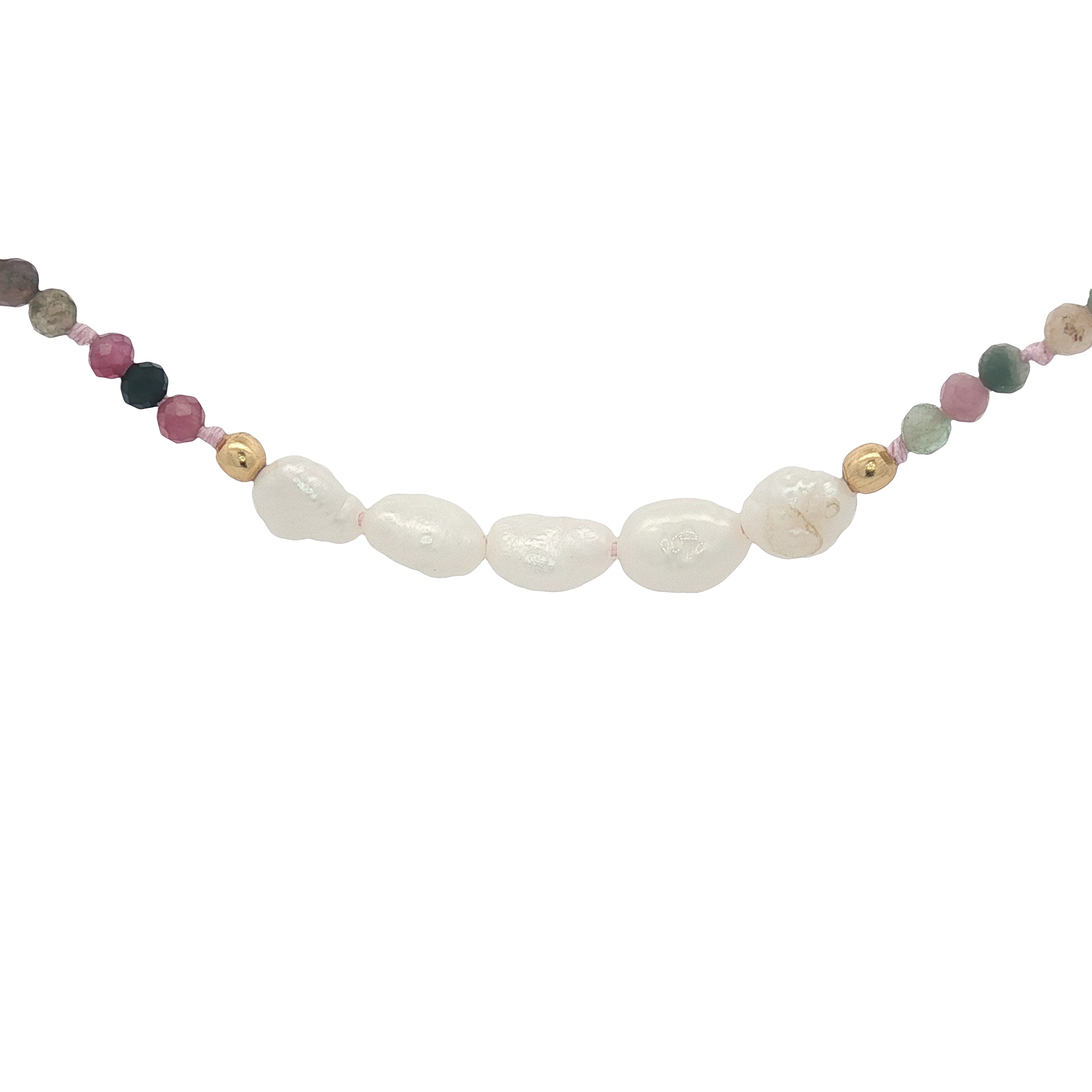 Collier doré en tourmaline, 5 perles de culture et perles dorées 42 cm