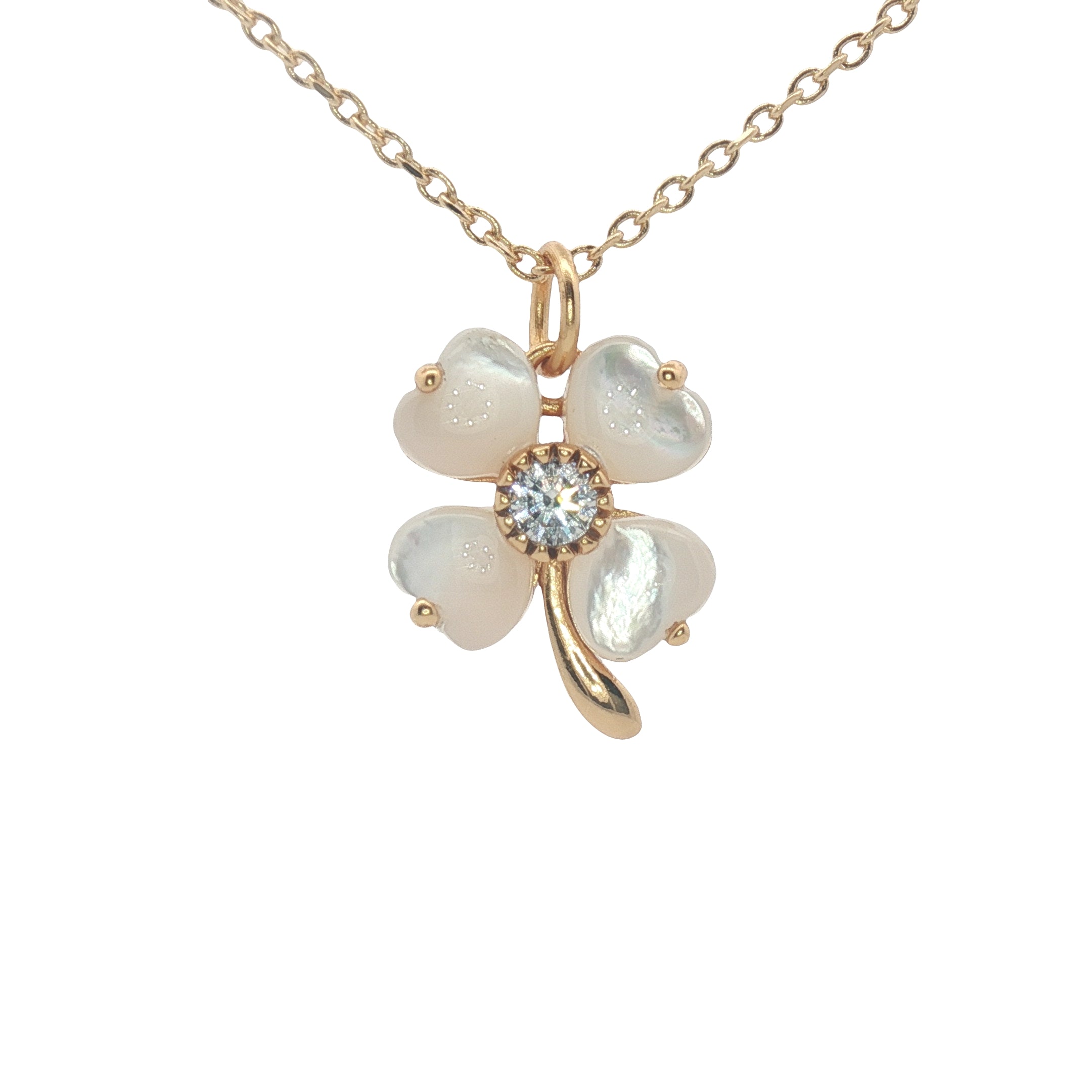 Collier doré trèfle en coquillage avec zircon 42 cm