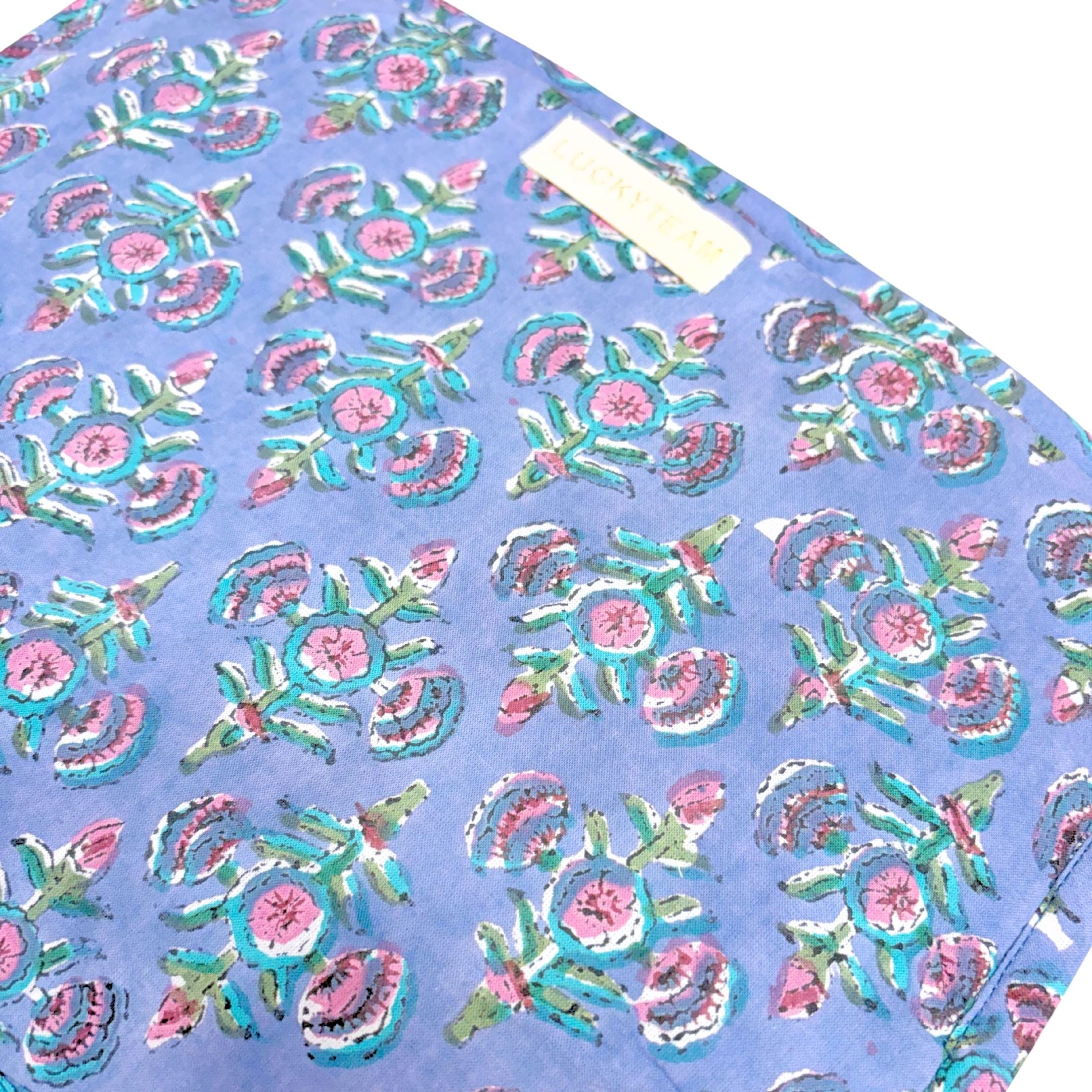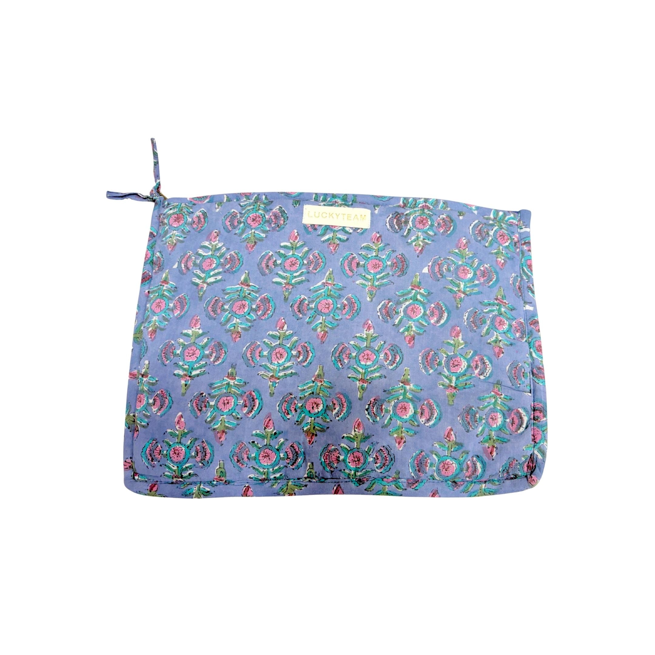 Grande pochette Block Print bleue à fleurs vertes et roses : 29 cm x 22 cm
