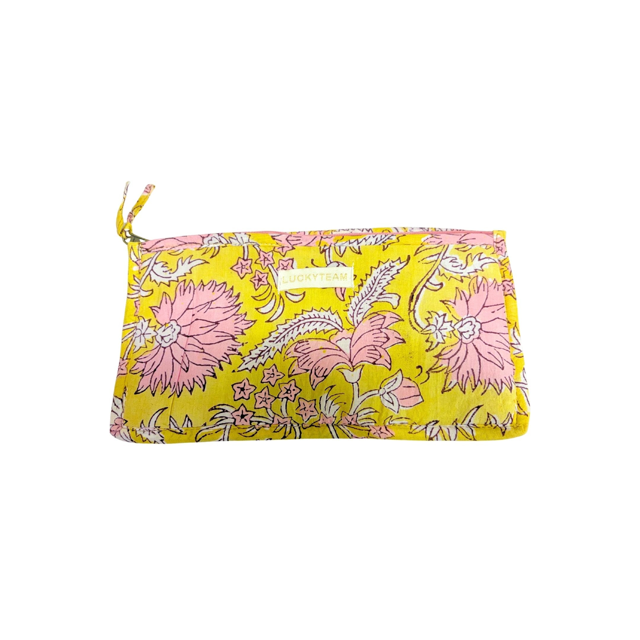 Yellow pouch with pink and white flowers