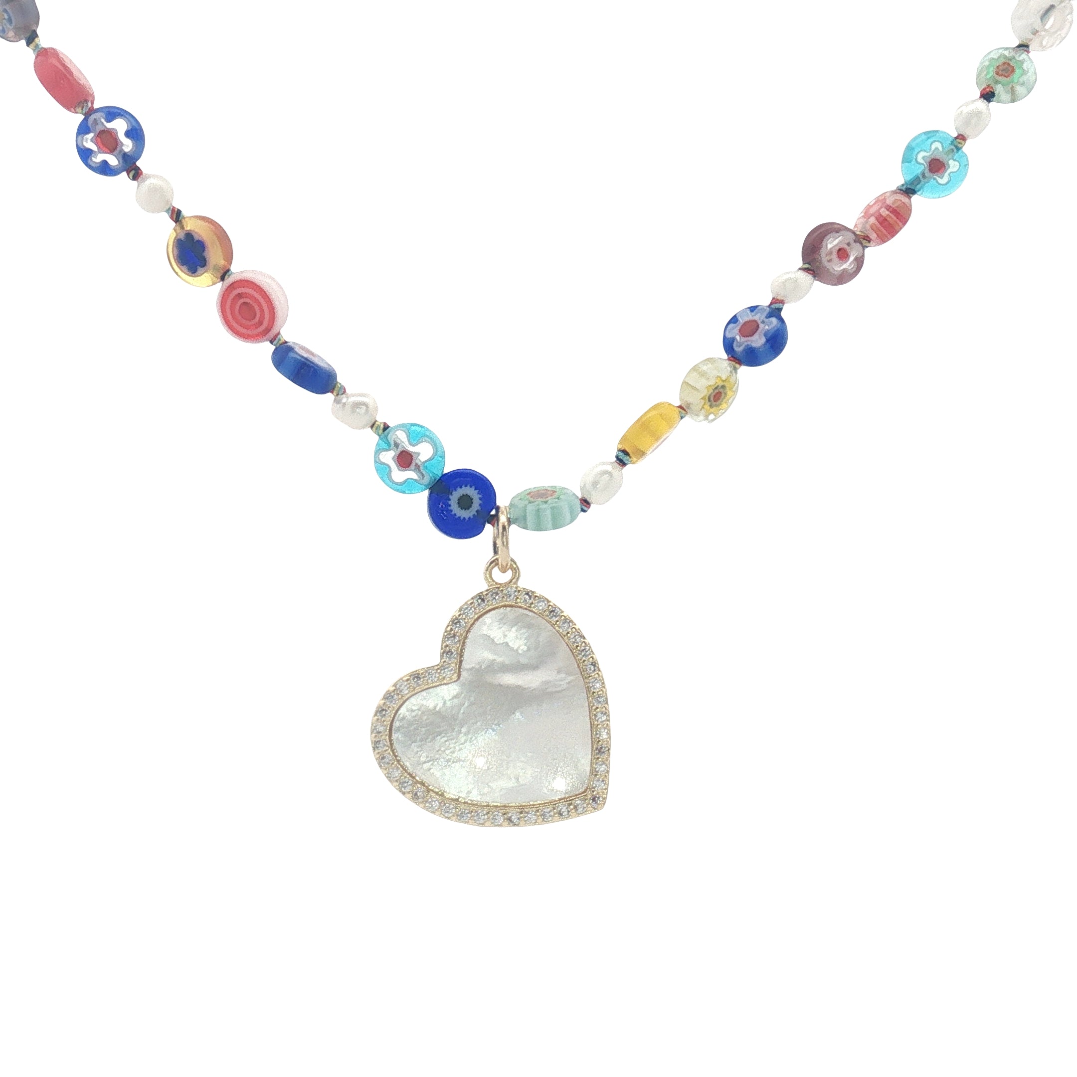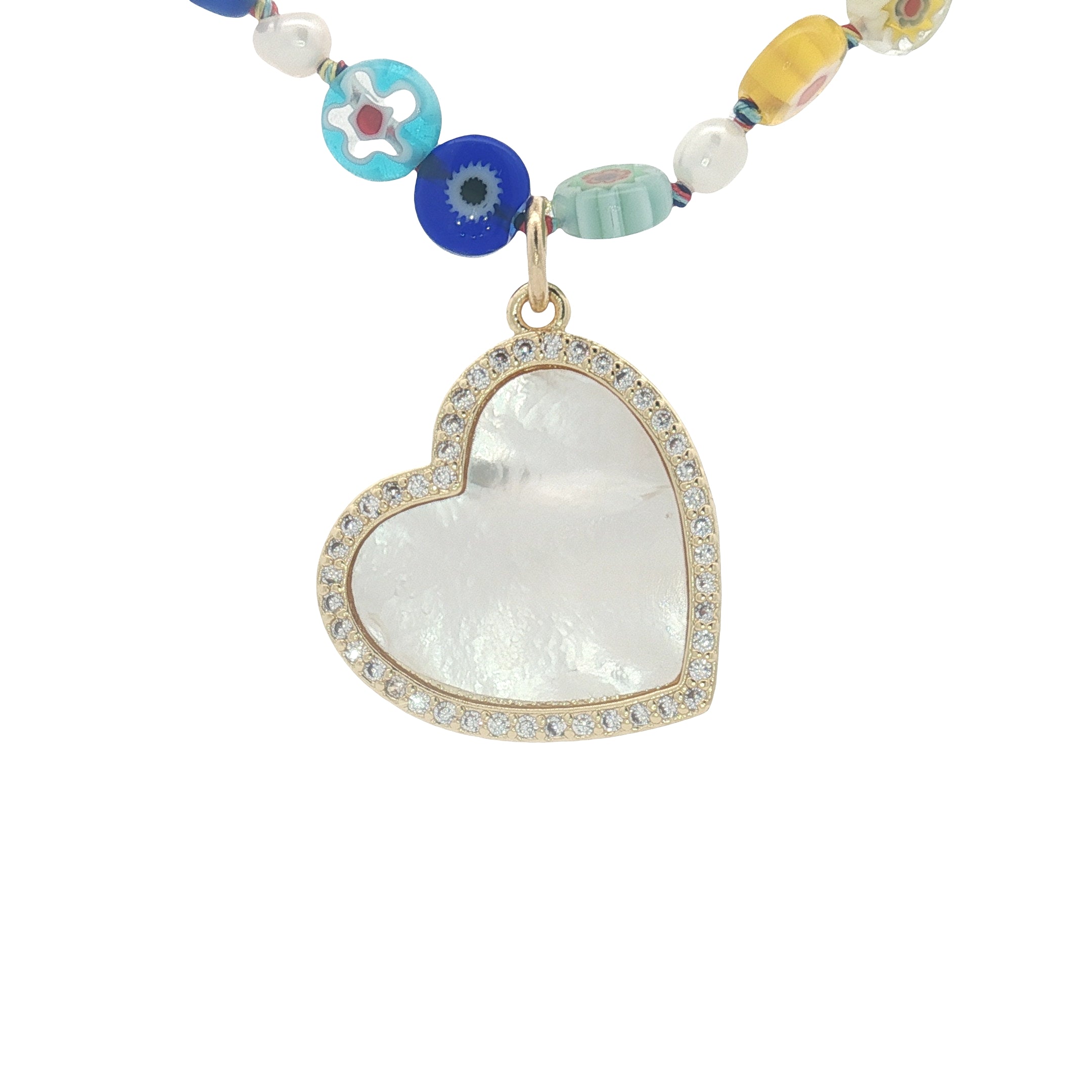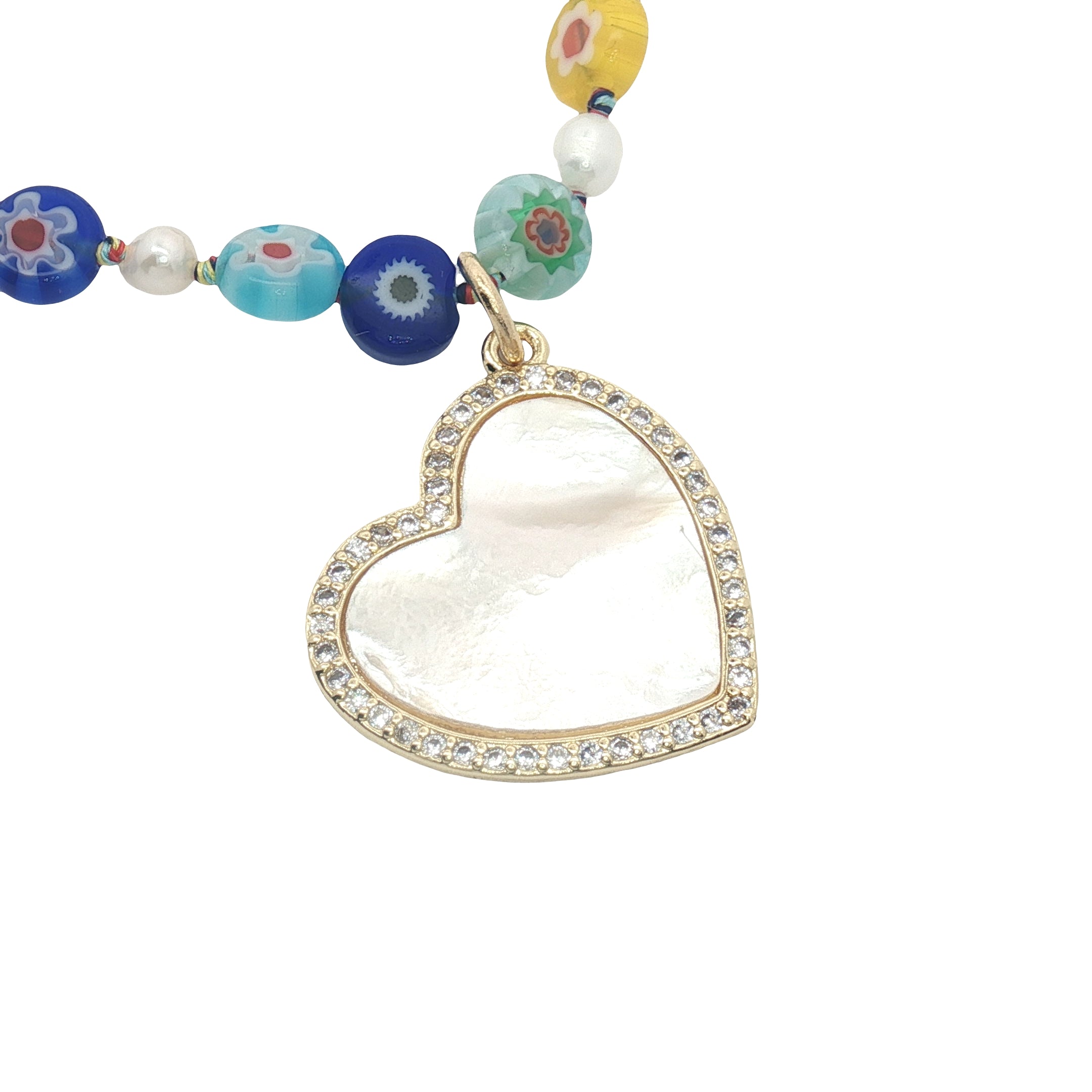 Collier doré coeur en nacre et zircons perles colorées avec fleurs 75 cm