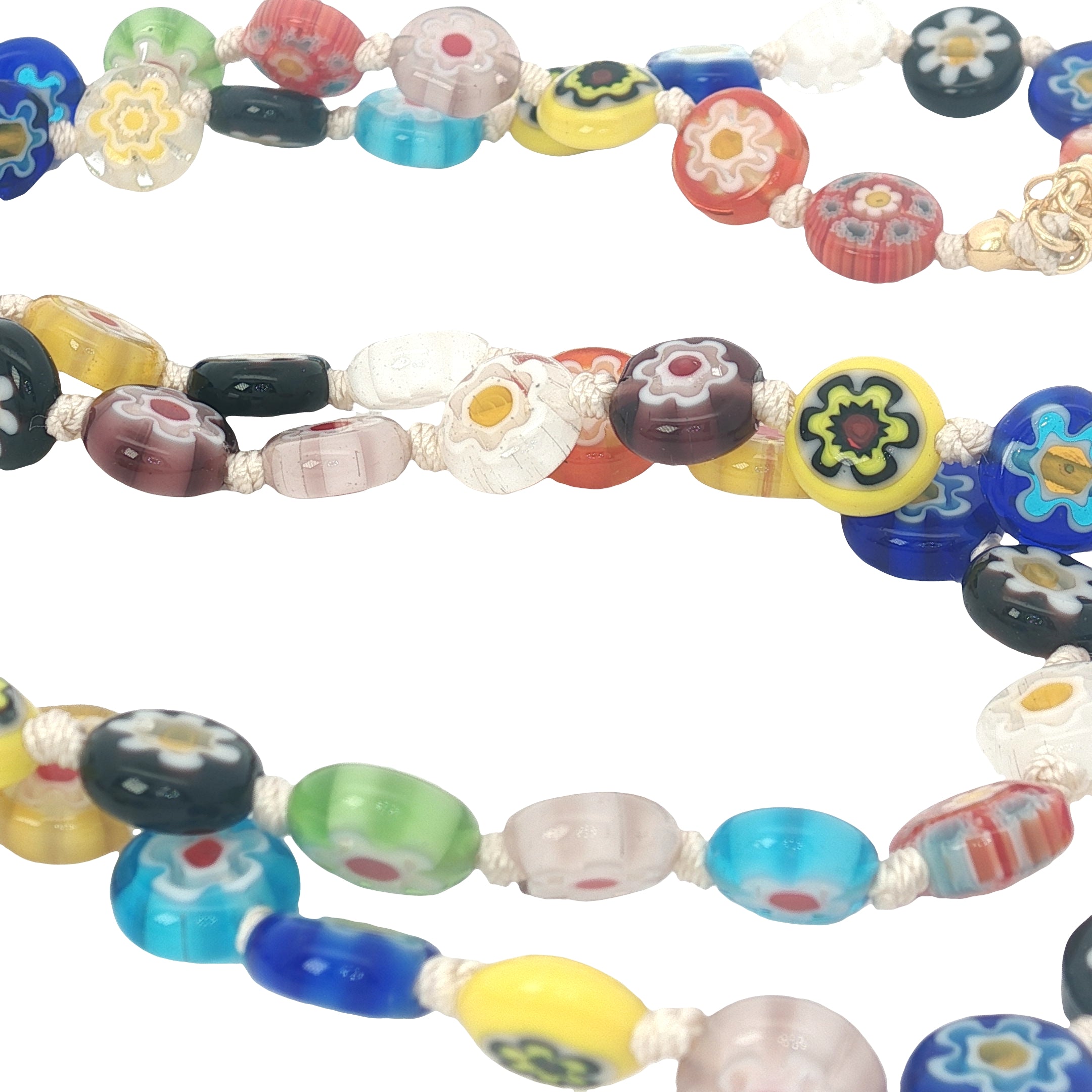 Collier en perles multicolores avec fleurs espacées d'un noeud blanc