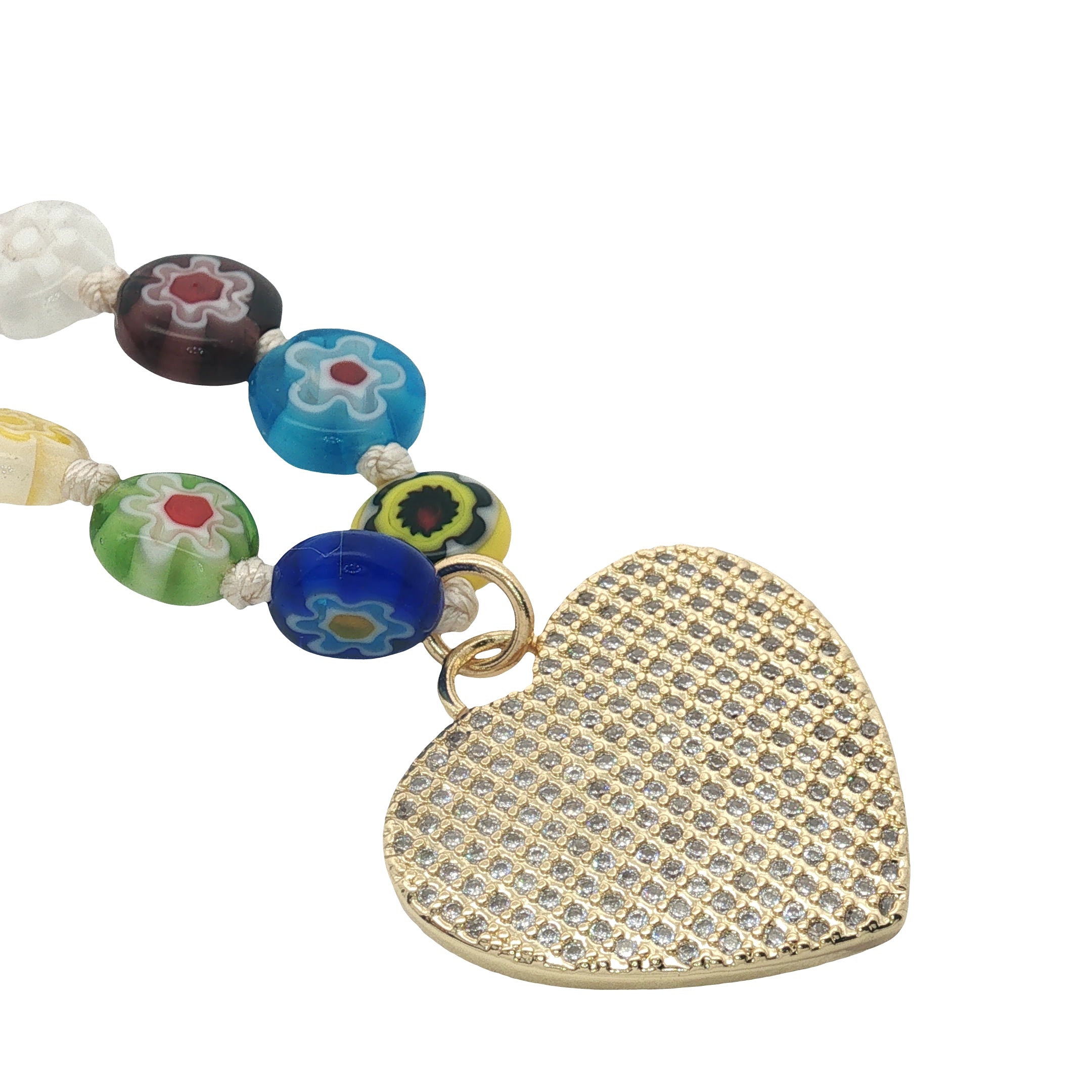 Collier doré perles multicolores avec fleurs coeur zircons 75 cm