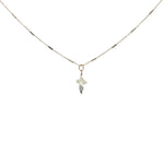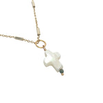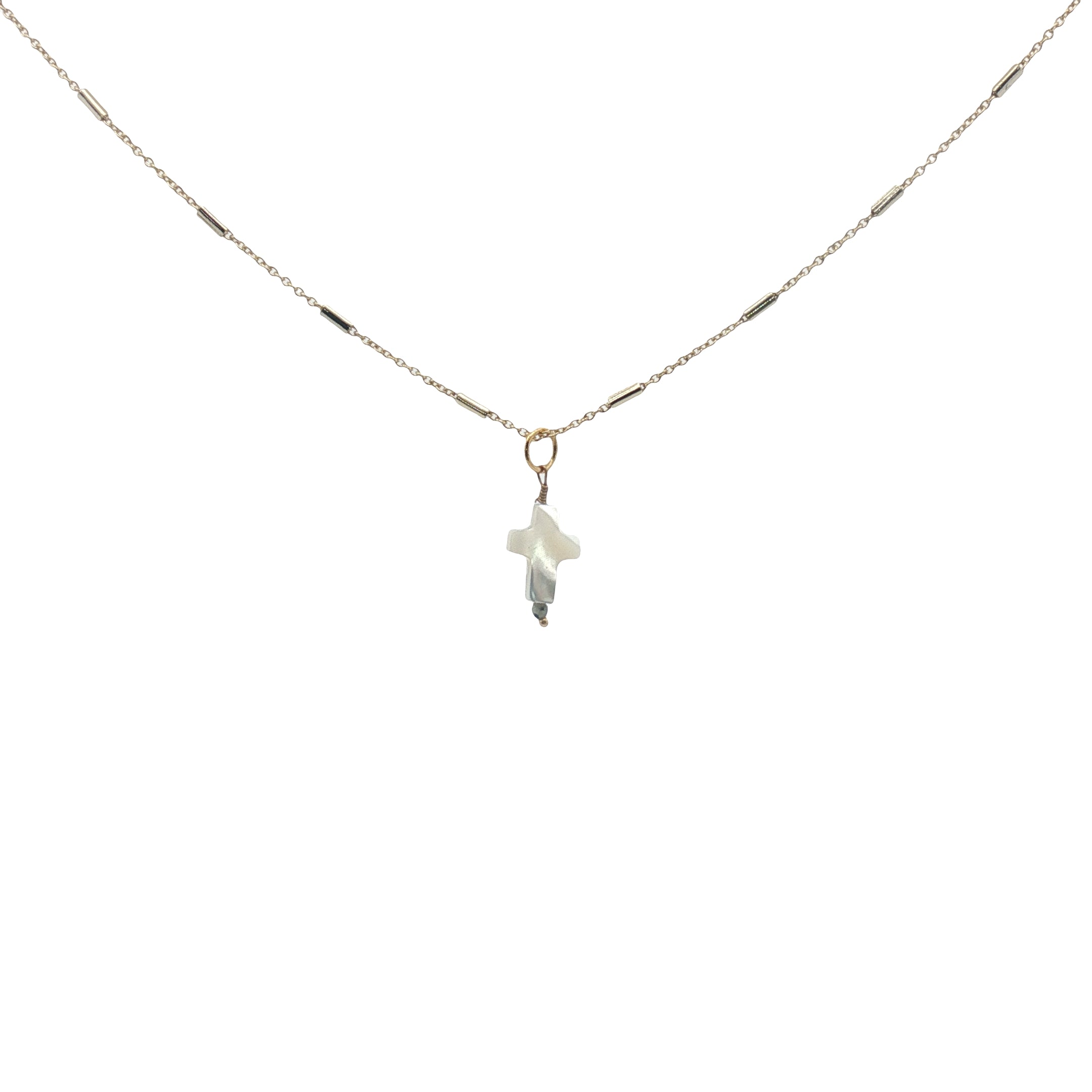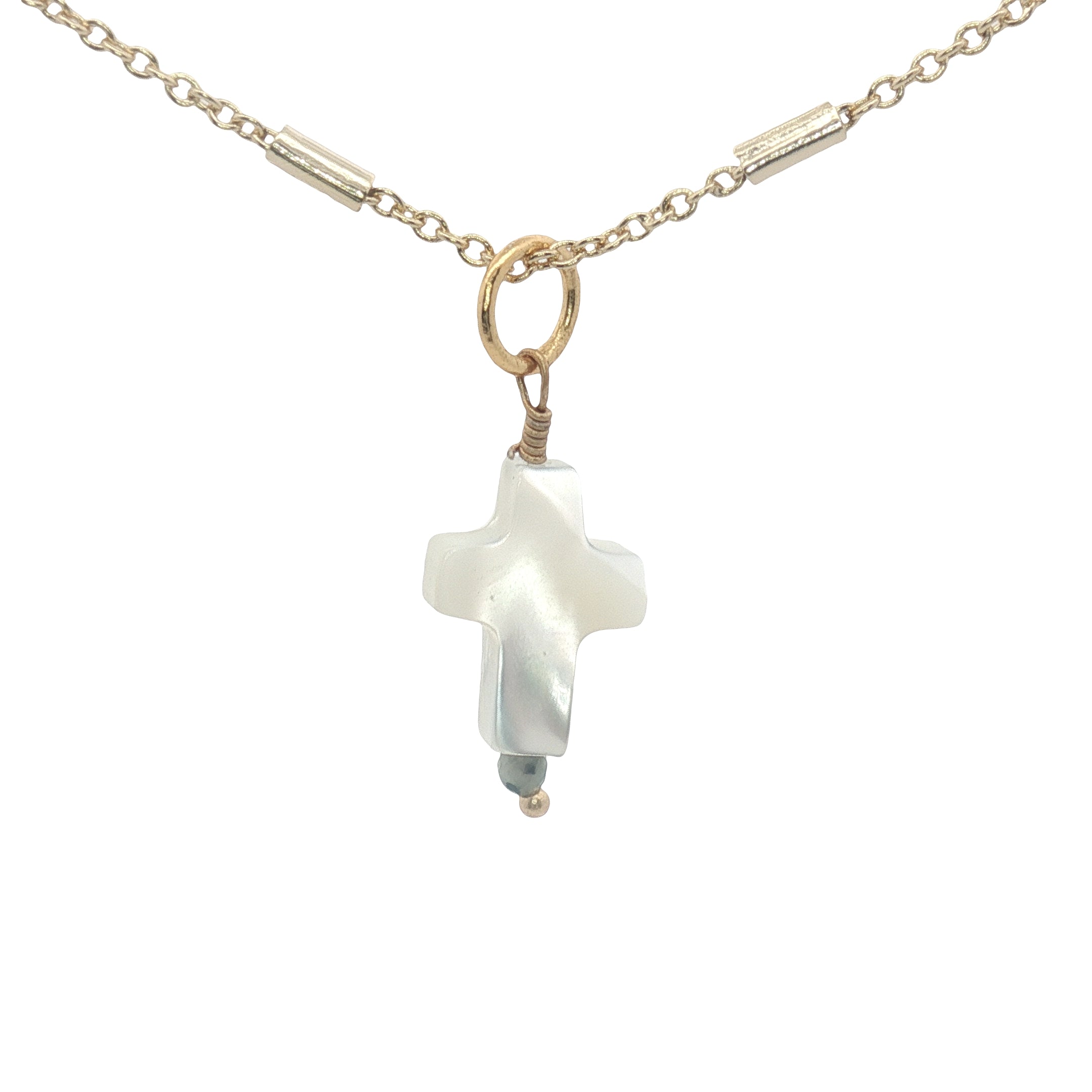 Collier doré croix en nacre blanche et petite tourmaline 42 cm