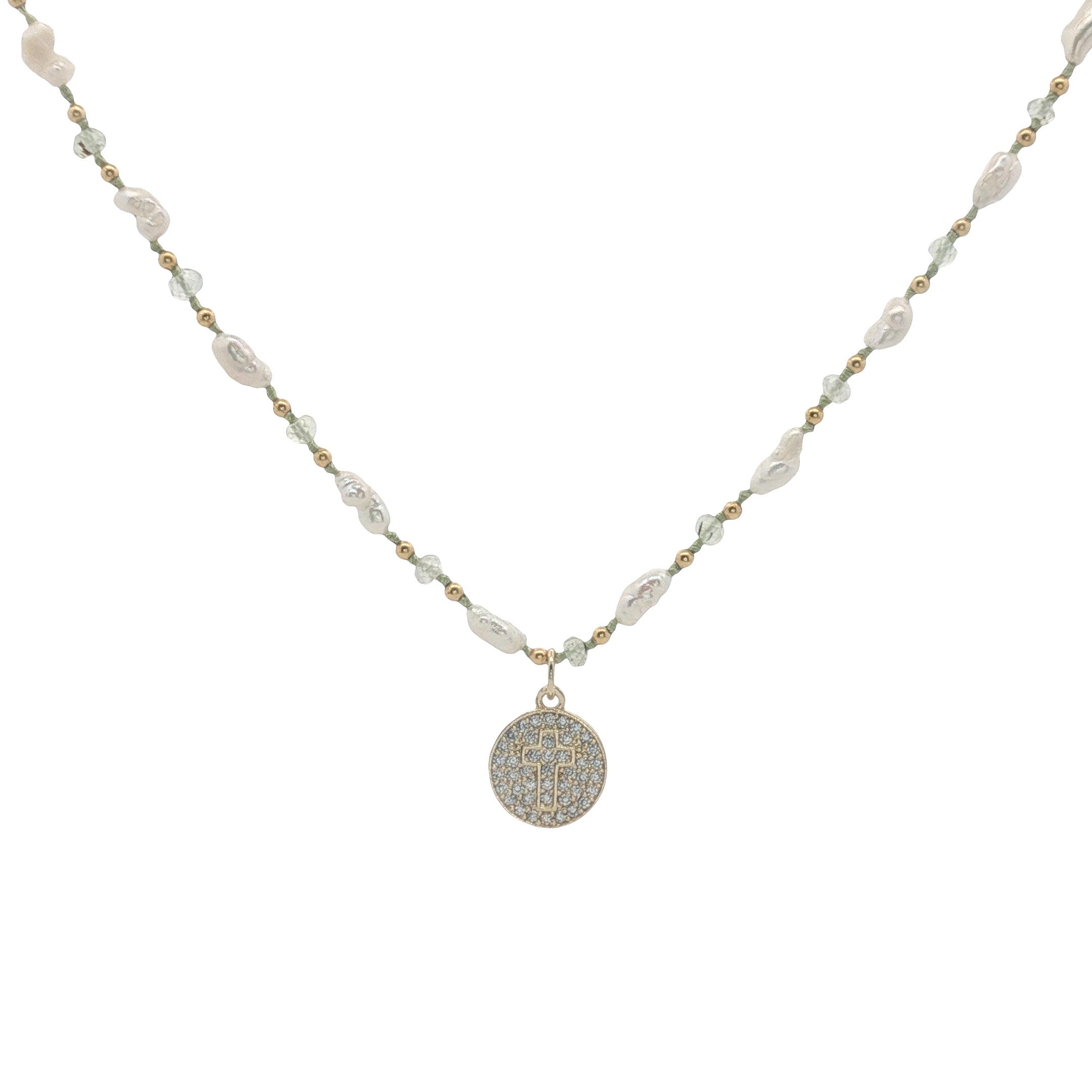 Collier doré médaille croix et zircons perles de culture, dorées et prehnite 60 cm