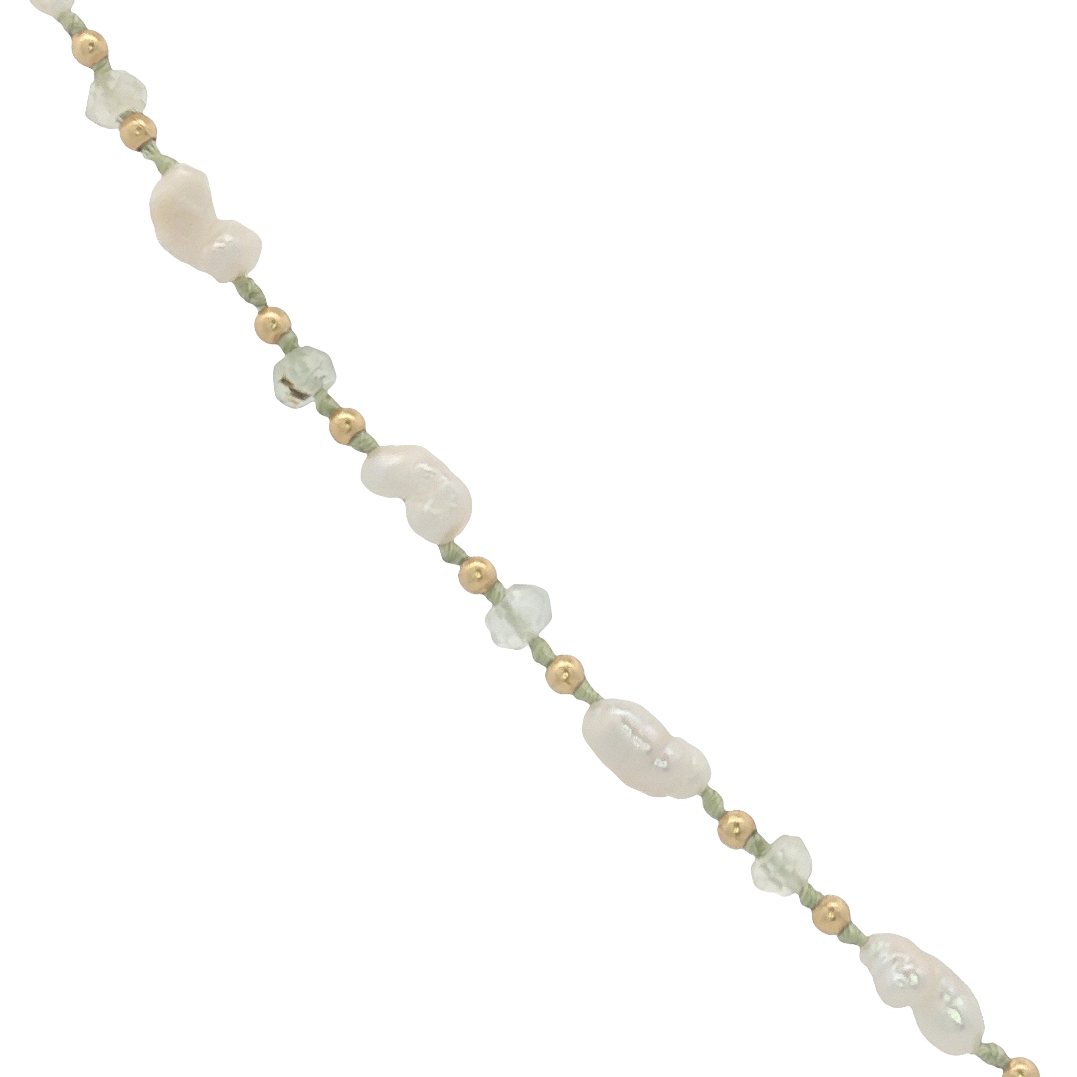 Collier avec alternance de perles de culture irrégulières, perles dorées, prehnite et noeuds verts